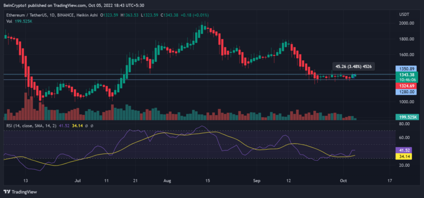 Zum Zeitpunkt der Veröffentlichung des Artikels liegt der ETH Preis bei 1.334 US-Dollar. Außerdem fiel der ETH Kurs im Laufe des Tages um 1,35 % und konsolidierte seit dem 22. September zwischen der Unterstützung bei 1.280 US-Dollar und 1.350 US-Dollar.