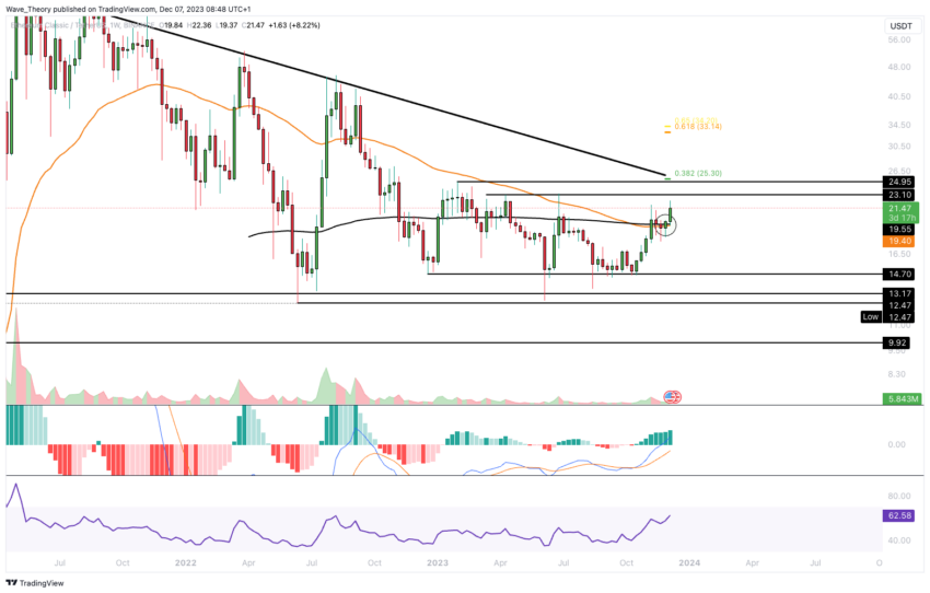 Aber auch hier erreicht der RSI allmählich überkaufte Regionen und droht sogar eine bärische Divergenz zu formen. Am Widerstandsbereich zwischen rund 23,1 USD und 25,3 USD könnte Ethereum Classic also zunächst auf Ablehnung stoßen.