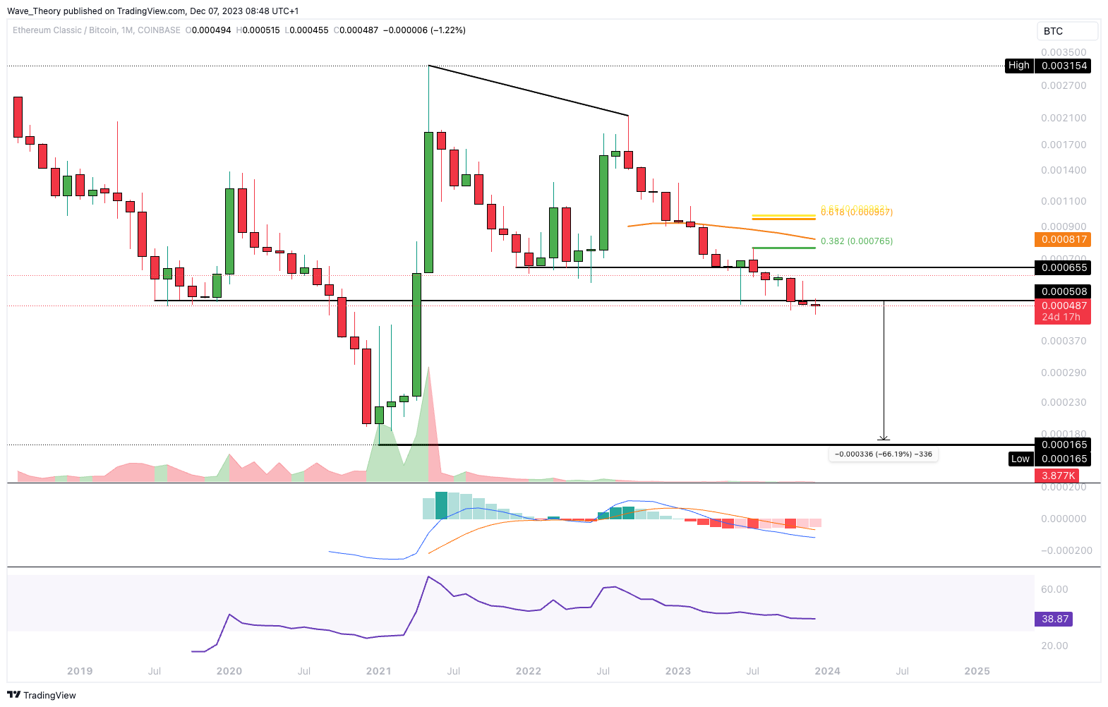Wenn die Unterstützungszone nicht hält, könnte der ETC Kurs zum letzten Tiefpunkt bei rund 0,000165 BTC korrigieren. Das impliziert ein Abwärtspotenzial von mehr als 66 %.