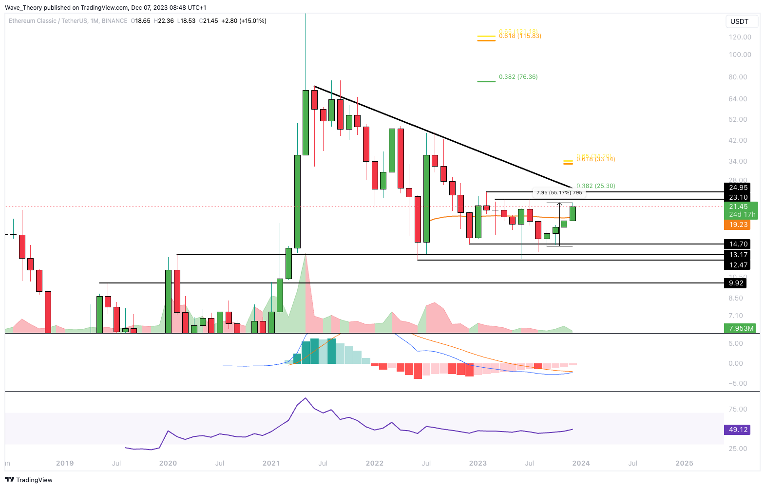 Wenn Ethereum Classic die Aufwärtsbewegung fortsetzt, warten bei rund 25,3 USD und 33,3 USD die entscheidenden Fib Widerstände. Am 0,382 Fib Niveau bei rund 25,3 USD verläuft zudem die bärische Trendlinie des gesamten Abwärtstrends.