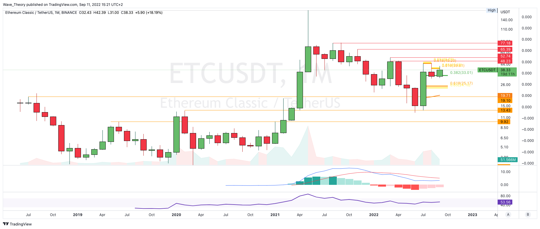 Trotz der kurzfristig bärischen Aussichten verläuft der ETC Kurs im September bisher bullisch. So tickt das Histogramm des MACDs den dritten Monat in Folge bullisch höher und ETC scheint in diesem Monat stark an der Fib Unterstützung bei rund 33 USD abzuprallen.