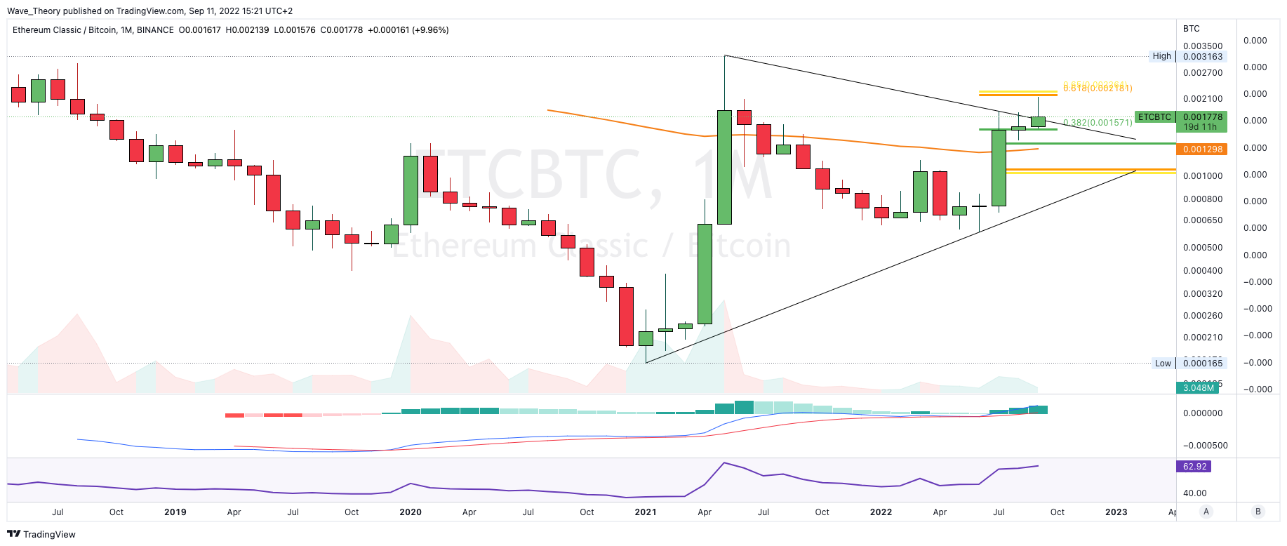 Gegen BTC könnte der ETC Kurs aus dem symmetrischen Dreieck ausbrechen, sofern der ETC Kurs die Golden Ratio bei rund 0,0022 BTC bullisch bricht. Dort scheint der ETC Kurs aber bisher bärisch abgewiesen zu werden.