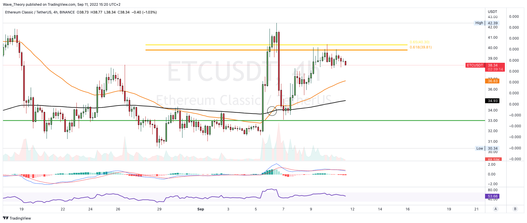 Ohne ein Bruch der Golden Ratio bei rund 40 USD wird der ETC Kurs womöglich kurzfristig korrigieren.
