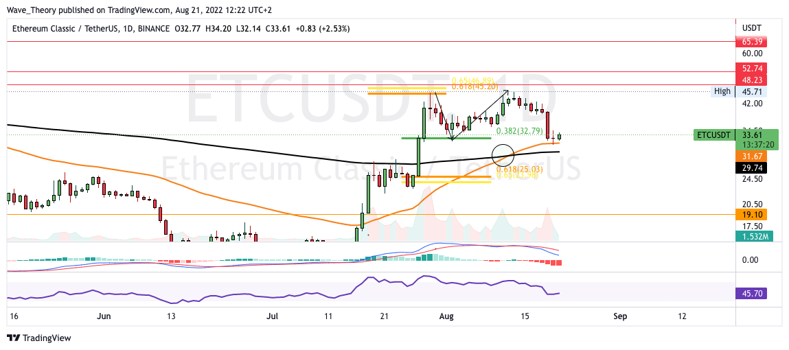 Der Ethereum Classic Kurs wurde ein zweites Mal am Golden Ratio Widerstand bei rund 46 USD abgewiesen und kehrte anschließend erneut zum Korrekturziel des 0,382 Fib Niveaus bei 32,8 USD zurück. Dieses Mal etablierte der ETC Kurs aber bei rund 31,2 USD einen Tiefpunkt und prallte damit am 50-Tage-EMA ab.