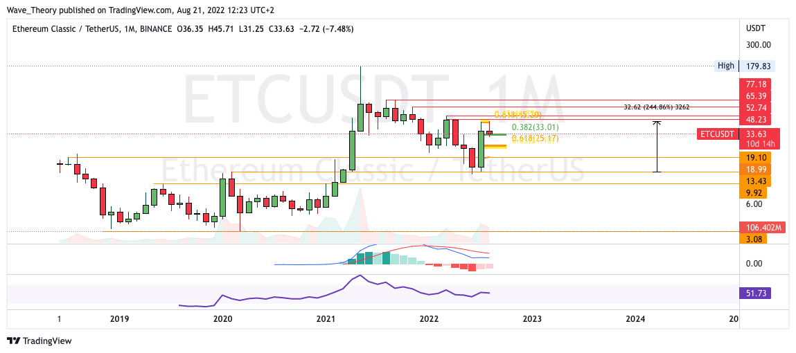 Dennoch könnte der ETC Kurs auch noch tiefer fallen, sollte ETC den 50-Wochen-EMA bei rund 31,8 USD bärisch brechen. Dann findet ETC erst wieder bei rund 25 USD signifikante Fibonacci Unterstützung.