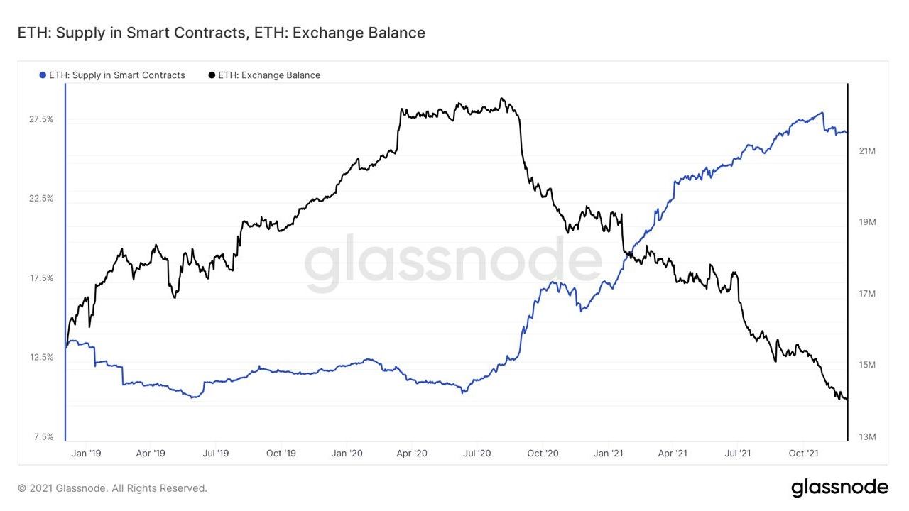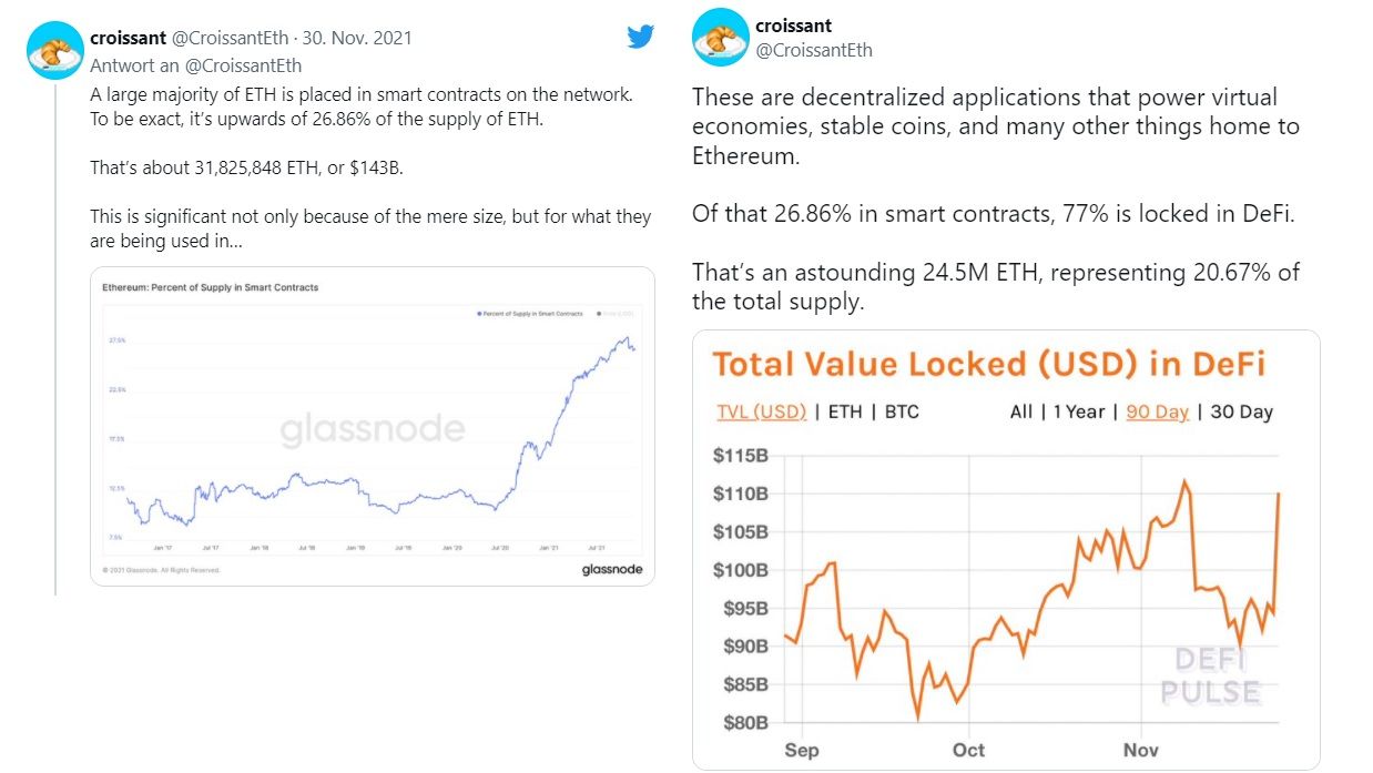 Der Krypto-Analyst Croissant erklärte auf Twitter, warum das so ist: Ein Großteil der Ethereum, die für Smart Contracts verwendet werden, arbeiten nämlich in DeFi-Applikationen und erschaffen damit einen echten Wert. Von diesen rund 27% sind 77% im DeFi-Bereich “gelockt”, d.h. sie werden in dort hinterlegt und können erstmal nicht aus diesem abzogen werden. Rund 24,5 Millionen ETH (zum aktuellen Ethereum Kurs sind das 110 Milliarden USD!) arbeiten also gerade in dem aufstrebenden Krypto-Markt-Sektor.