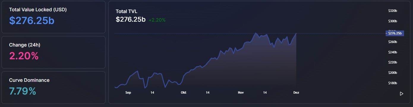 Laut dem DeFi-Tracker DefiLama befindet sich der DeFi-TVL (Ethereum-DeFi und der Rest zusammen) momentan nur etwas unter dem letzten Allzeithoch (276,5 Milliarden US-Dollar). Außerdem ist dieser Wert seit Anfang Oktober (193,5 Milliarden US-Dollar) um ca. 40% angestiegen. Der Anstieg ist natürlich auch darauf zurückzuführen, dass die Krypto-Preise seit Anfang Oktober stark zunahmen – der Ethereum Kurs legte beispielsweise seit dem 1. Oktober 2021 rund 40% zu.