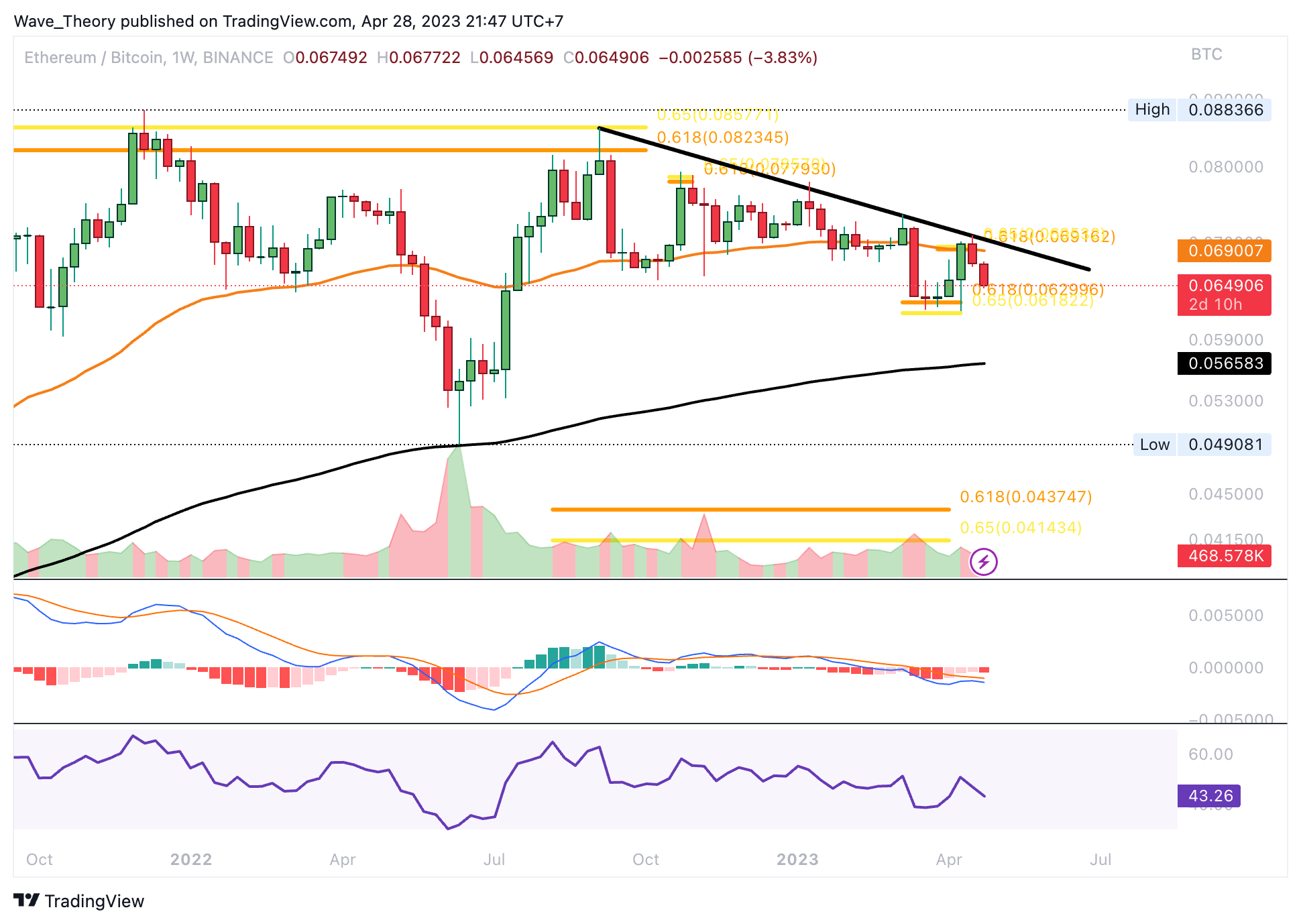 Gegen BTC könnte der ETH Kurs zur Golden Ratio Unterstützung bei rund 0,063 BTC zurückkehren