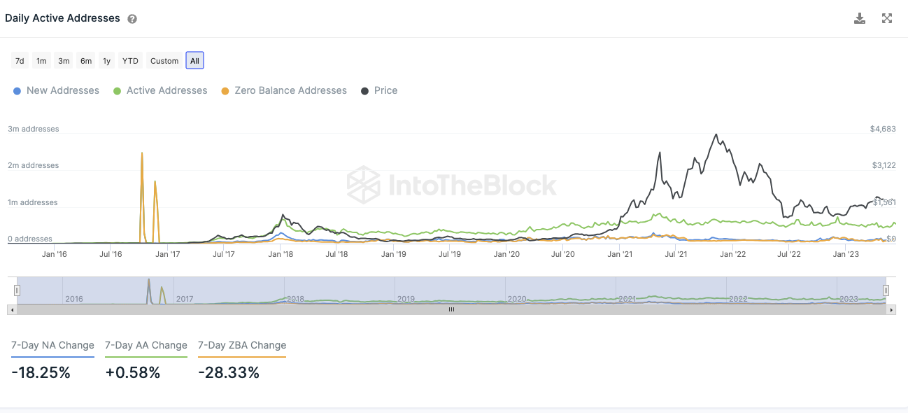 Die Anzahl an neuen Adressen, die Ethereum halten, hat in den letzten sieben Tagen um 18,25 % abgenommen. Die Anzahl an aktiven täglichen Adressen hat dabei einen leichten Zuwachs von 0,58 % erfahren, wohingegen die Anzahl an Ethereum Adressen ohne ETH Guthaben sogar um 28,33 % gesunken ist.