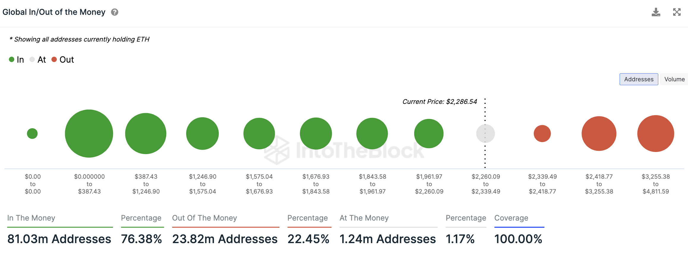 Über 76 % der Ethereum Adressen befinden sich zum aktuellen Kurs von rund 2.300 USD im Plus. Lediglich 22,5 % der ETH Adressen ist dabei im Minus, wohingegen sich rund 1,17 % der Adressen am Break-even Punkt befindet.