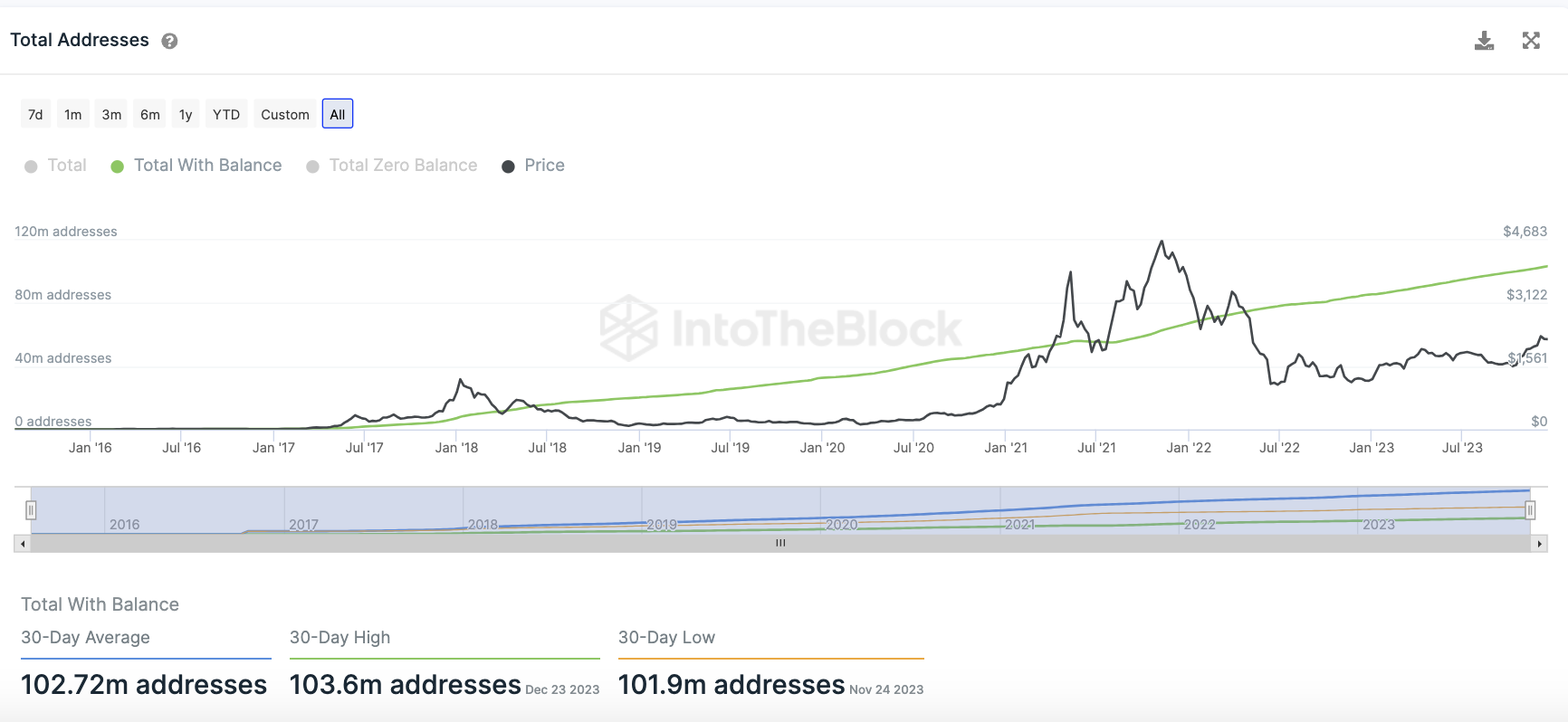 Die Gesamtanzahl an Ethereum Adressen befindet sich in einem stabilen Aufwärtstrend. So lagen in den letzten 30 Tagen durchschnittlich 102,72 Millionen ETH Adressen vor. Das sind mehr als doppelt so viele wie für BTC.