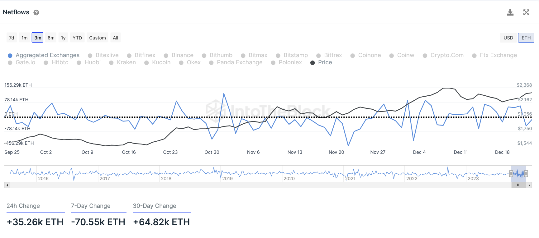 Ebenso wurden in den letzten 30 Tagen mehr ETH auf Börsen eingezahlt als abgehoben. In diesem Zeitfenster erreicht die Zahl sogar ungefähr 65.000 ETH.