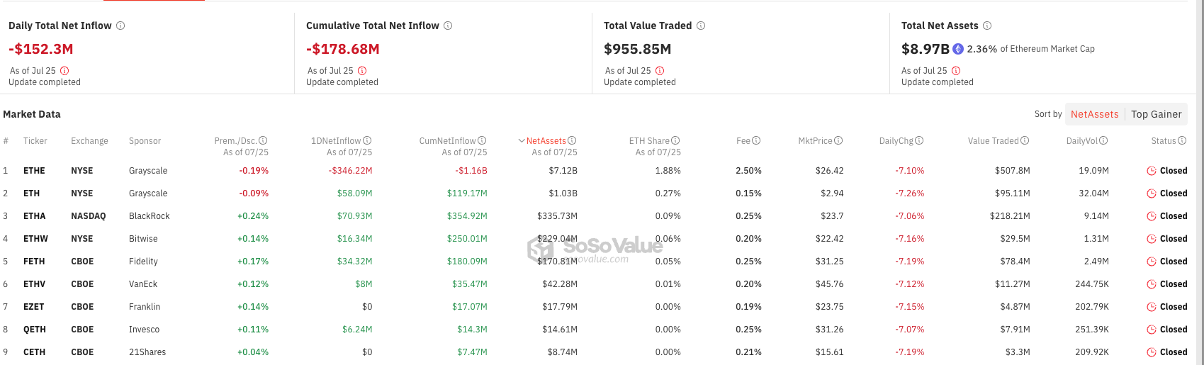 Darüber hinaus stellten die Analysten von SoSoValue fest, dass Ethereum-ETFs kurzfristig wahrscheinlich keinen signifikanten Einfluss auf den Kauf- oder Verkaufsdruck haben werden. Während der Bitcoin-Spot-ETF erhebliche tägliche Nettozuflüsse verzeichnete, die seinen Marktpreis direkt beeinflussten, fehlt dem ETH-ETF derzeit dieses marktbewegende Potenzial.