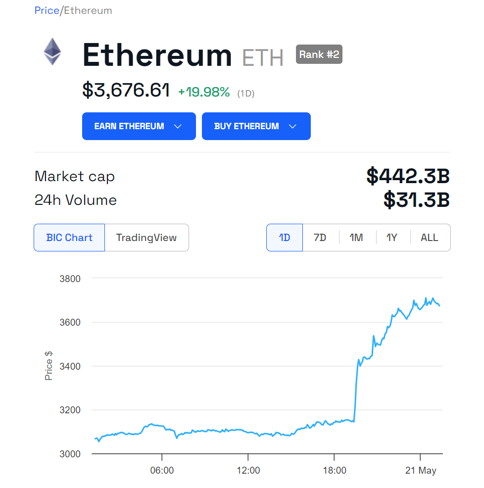 Nach dieser Nachricht ist der Ethereum Kurs signifikant gestiegen. Laut den Daten von BeInCrypto ist der ETH Kurs in den letzten 24 Stunden um 19,98 Prozent gestiegen. Aktuell wird ETH bei 3.649 USD gehandelt.