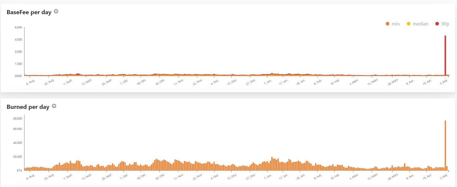 Die Ethereum-Transaktionsgebühren erreichen immer wieder kurzzeitig extreme Preise, wenn ein Projekt stark gehypt wird. Am 1. Mai stiegen die ETH-Transaktionsgebühren auf den höchsten Stand seit Mai 2021. Darüber hinaus führte die hohe Netzwerkauslastung zu Ausfällen auf der Ethereum-Blockchain.