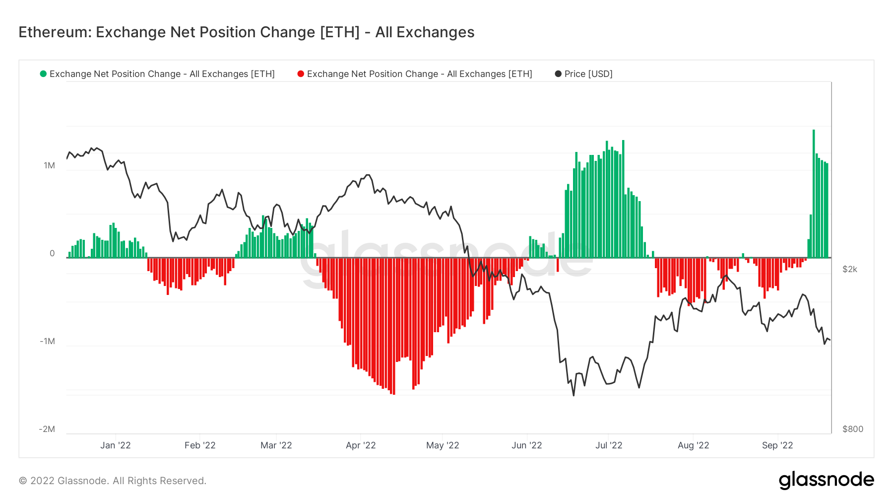 Wie die Daten von Analysefirma Glassnode zeigen, flossen unmittelbar nach dem Merge unglaublich viele Ethereum zu Börsenaccounts. Üblicherweise wird dieses Vorgehen als Zeichen für anstehende Preisstürze gesehen. Die Vermutung dahinter: Investoren senden ihre Kryptos von den Hardware Wallets auf die Börsen, um sie dort zu verkaufen.