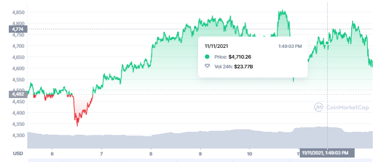 Der Ethereum Kurs konnte am 10. November 2021 ein neues Allzeithoch bei 4.865 US-Dollar ausbilden. Wie BeInCrypto bereits berichtete, könnte der ETH Kurs in der kommenden Zeit noch viel bullischer ausbrechen und sogar auf 11.500 US-Dollar ansteigen.