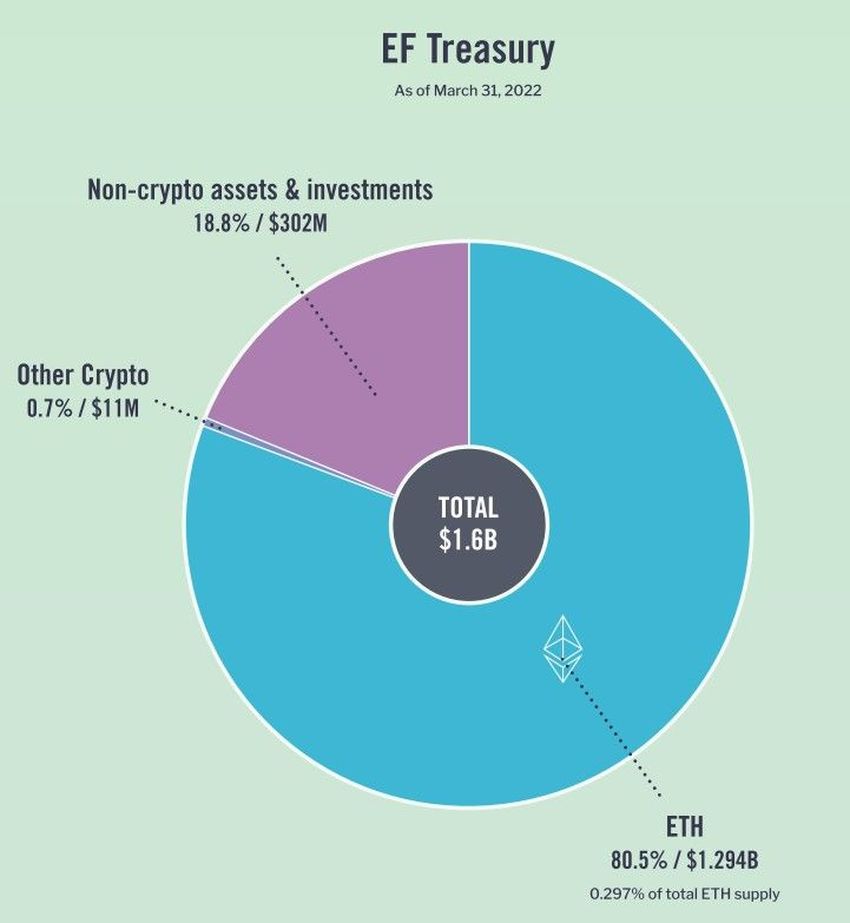 Laut dem Report hält die Ethereum Foundation Assets im Wert von rund 1,6 Milliarden US-Dollar, davon allein Ende März 2022 1,3 Milliarden US-Dollar in Kryptowährungen. Die Non-Profit-Organisation hält 99,1 % ihrer Krypto-Bestände in Ethereum, die Summe entspricht umgerechnet in etwa 0,297 % aller existierenden ETH.