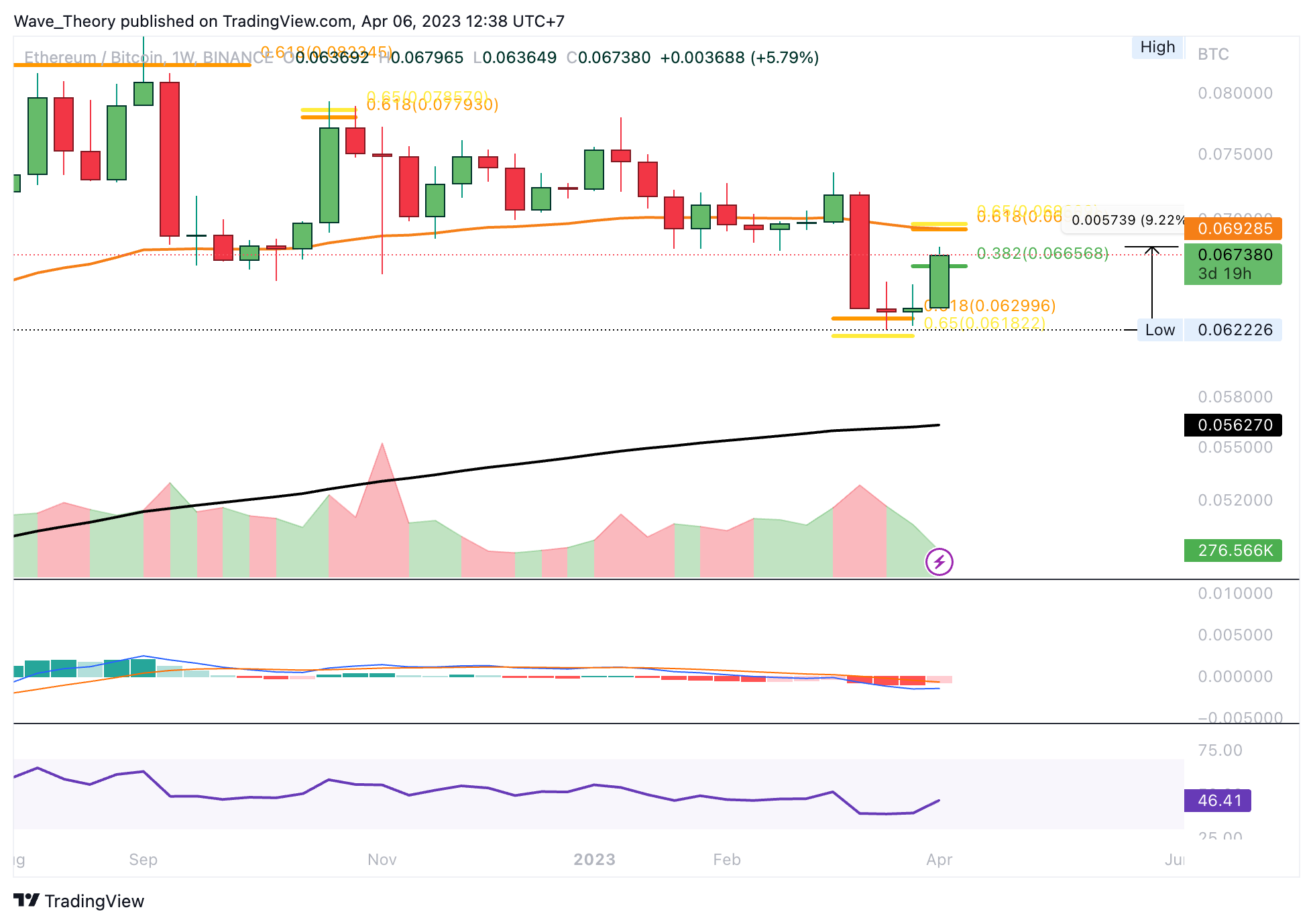 Gegen BTC konnte der ETH Kurs an der Golden Ratio Unterstützung bei rund 0,063 BTC bullisch abprallen. Anschließend konnte Ethereum bereits den 0,382 Fib Widerstand bei rund 0,0678 BTC überwinden. Damit wartet jetzt bei rund 0,07 BTC der nächste signifikante Fib Widerstand. Dort fungiert der 50-Wochen-EMA als zusätzlicher Widerstand.