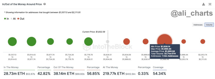 Ali Martinez, Head of News von BeInCrypto, bestätigt diesen Trend. Er bezieht sich auf On-Chain-Daten von IntoTheBlock und weist auf ein signifikantes Widerstandsniveau hin. In einem X (ehemals Twitter) Beitrag schrieb er: