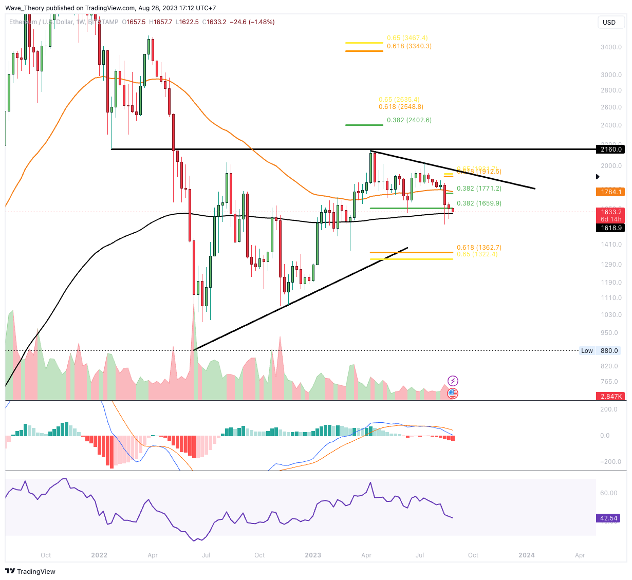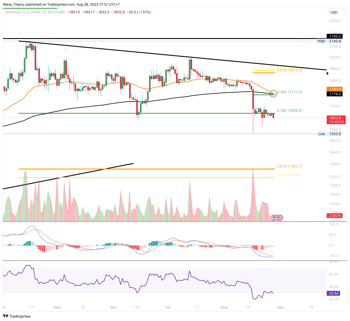 Dennoch scheint der ETH Kurs die 0,382 Fib Unterstützung bei rund 1.660 USD bärisch zu durchbrechen. Damit könnte der Kurs mittelfristig zur Golden Ratio Unterstützung bei rund 1.350 USD zurückkehren. Dort könnte der Kurs aber heftig abprallen.