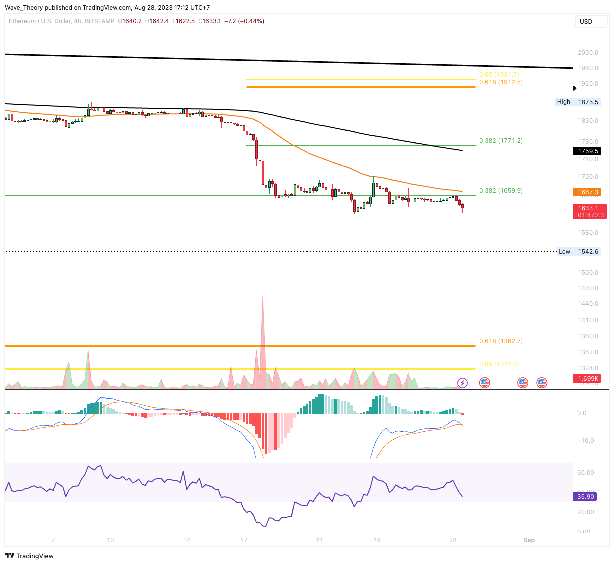Darüber hinaus wurde der ETH Kurs vor wenigen Tagen am 50-4H-EMA Widerstand bei rund 1.667 USD bärisch abgewiesen. Derzeit sieht es also eher nach einer Fortsetzung der Abwärtsbewegung aus.