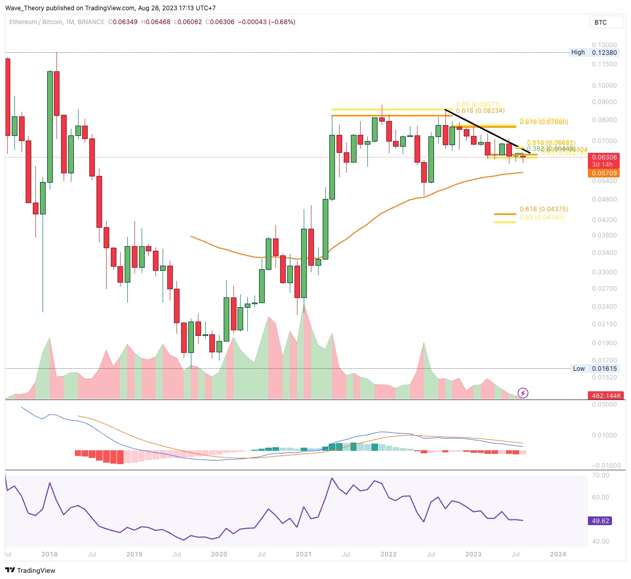 Gegen Bitcoin befindet sich der ETH Kurs seit Monaten an der Golden Ratio Unterstützung bei rund 0,063 BTC. Wenn sie bärisch durchbrochen wird, könnte der Kurs zum 50-Monate-EMA bei rund 0,057 BTC korrigieren. Das impliziert ein Abwärtspotenzial von rund 9 %.