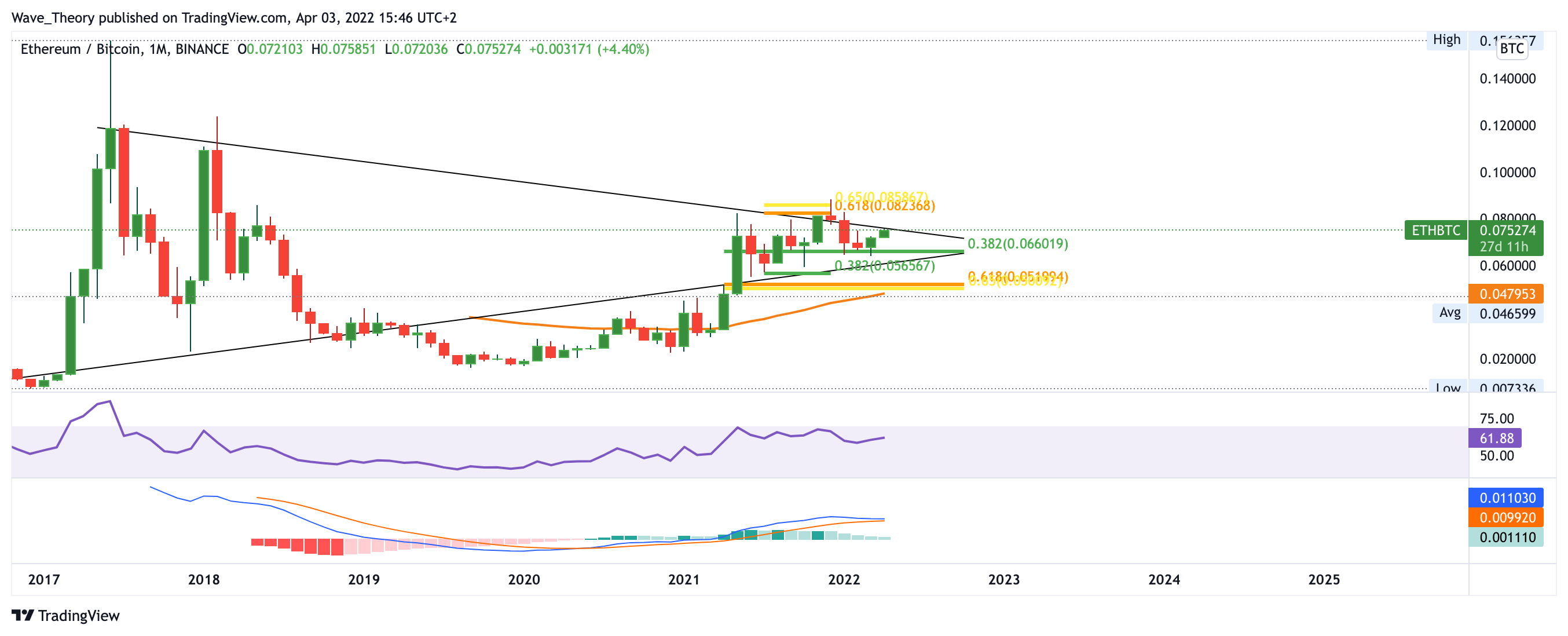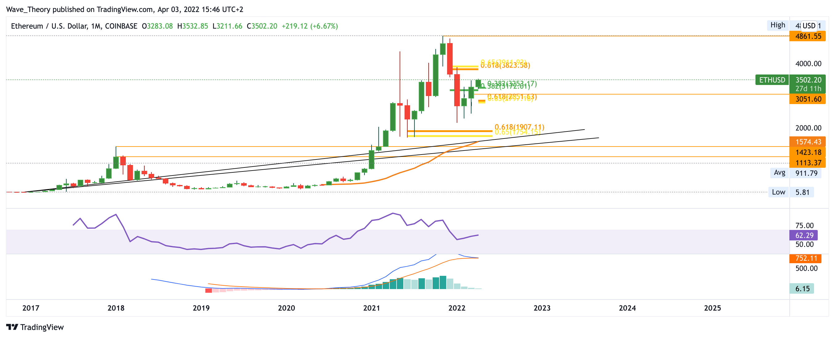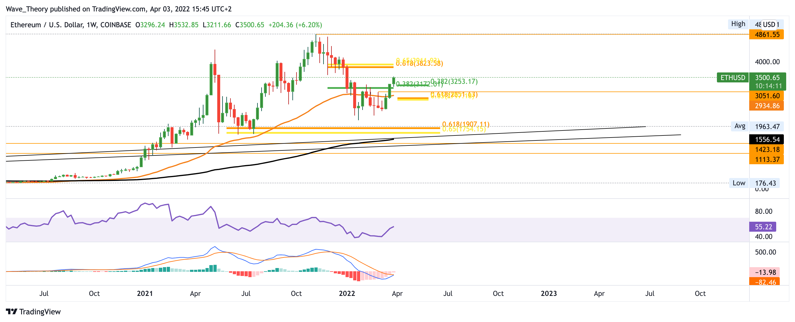 Der ETH Kurs schließt nicht nur die dritte Woche in Folge bullisch ab, sondern befindet sich derzeit auch im dritten bullischen Monat in Folge. Dennoch zeigt sich der MACD noch immer bärisch im Monatschart. Sollte es dem ETH Kurs jedoch gelingen, den Golden Ratio Widerstand bei rund 3.900 USD hinter sich zu lassen, könnte sich auch der MACD bullisch verändern. Eine Ablehnung an der Golden Ratio bei rund 3.900 USD könnte Ethereum aber auch eine Etage tiefer reißen, denn damit wäre der Bärentrend nicht gebrochen, sondern bärisch bestätigt. Sollten die Fibonacci Unterstützungen bei rund 3.200 USD und 2.800 USD dann nicht halten, könnte Ethereum sogar bis zur Golden Ratio bei rund 1.900 USD korrigieren.