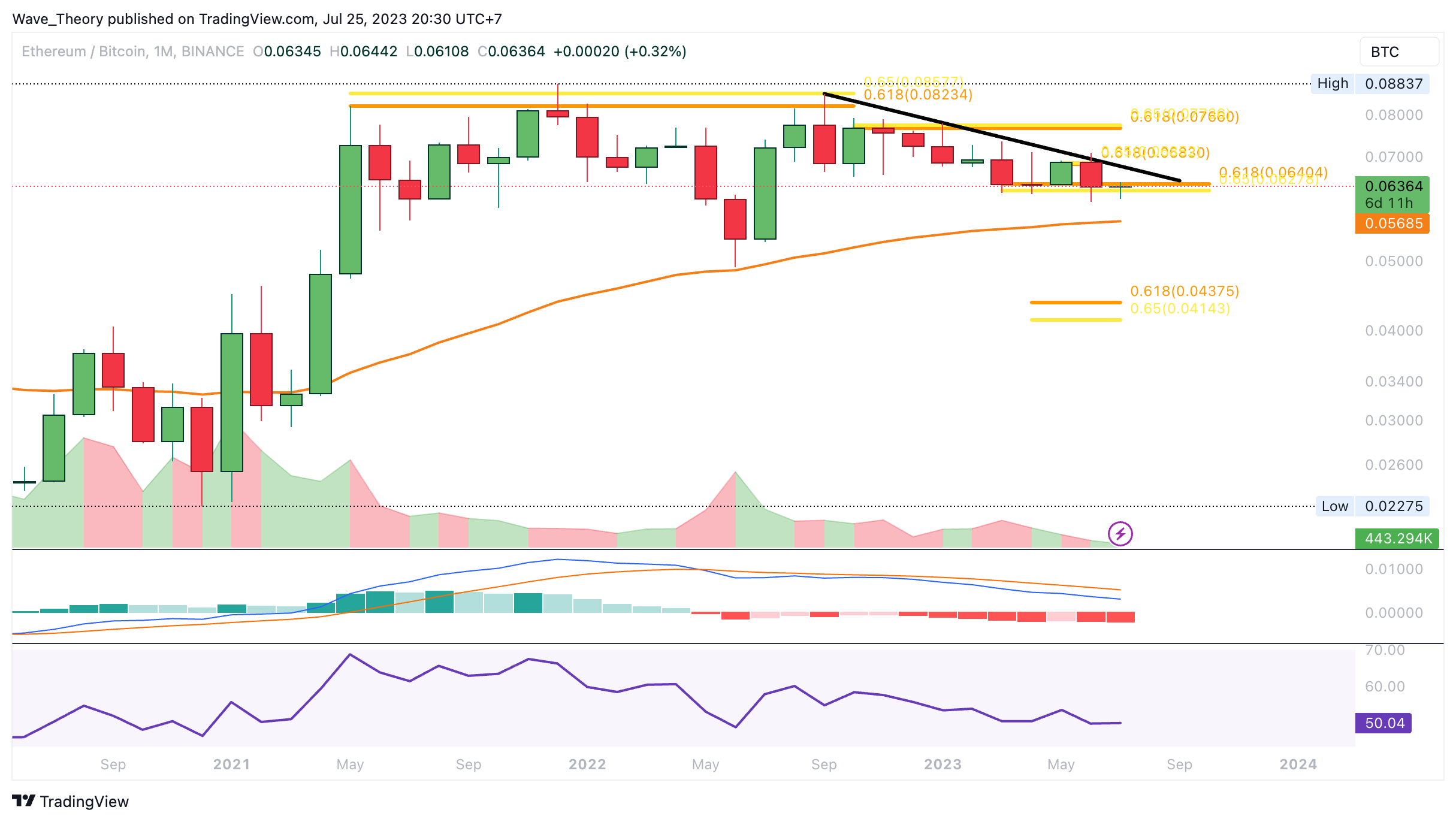 Gegen BTC sah es zunächst danach aus, dass der ETH Kurs die Golden Ratio Unterstützung bei rund 0,062 BTC bärisch bricht. Doch aktuell kämpft sich der ETH Kurs wieder nach oben, womit der Kurs im Monatschart über der Golden Ratio Unterstützung schließen könnte. Damit stößt ETH dann bei rund 0,0685 BTC auf den nächsten signifikanten Fib Widerstand.