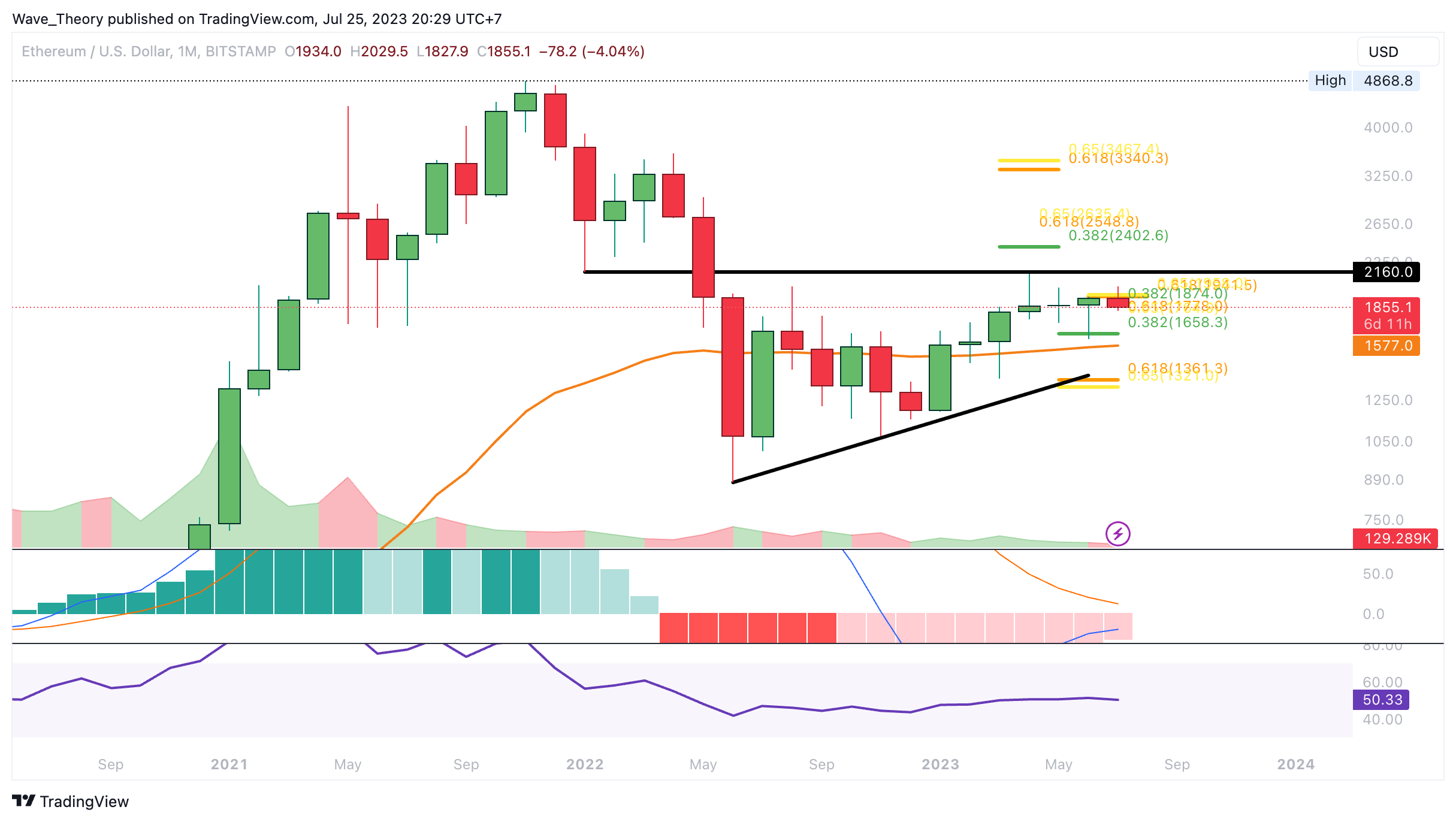 Ansonsten tickt das Histogramm des MACDs im Monatschart aber immer noch bullisch höher. Damit könnten sich auch die MACD Linien bald bullisch überkreuzen. Sollte es Ethereum gelingen, den Golden Ratio Widerstand bei rund 1.945 USD zu brechen, wartet zwischen rund 2.140 USD und 2.160 USD der nächste signifikante Widerstand.