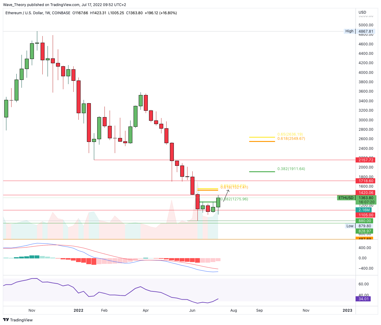 Wirklich spannend wird jedoch die Reaktion von Ethereum an den nächsten großen Fibonacci Widerständen. Denn sollte Ethereum die Golden Ratio bei rund 1.550 USD bullisch brechen, könnte Ethereum bis zum 0,382 Fib Niveau bei rund 1.910 USD oder gar bis zur Golden Ratio bei rund 2.600 USD steigen. Das entspricht annähernd einer Verdopplung des Kurses.