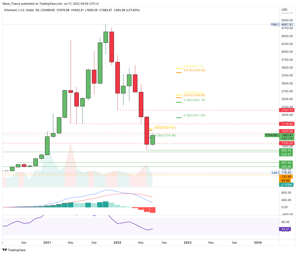 Erst wenn Ethereum die Golden Ratio bei rund 3.400 USD bullisch bricht, befindet sich Ethereum in einem neuen Bullenzyklus. Zudem erwartet den Ethereum Kurs zwischen 1.420 und 1.720 USD horizontaler Widerstand. Des Weiteren sind die MACD Linien im Monatschart noch immer bärisch überkreuzt und auch das Histogramm tickt noch bärisch tiefer.