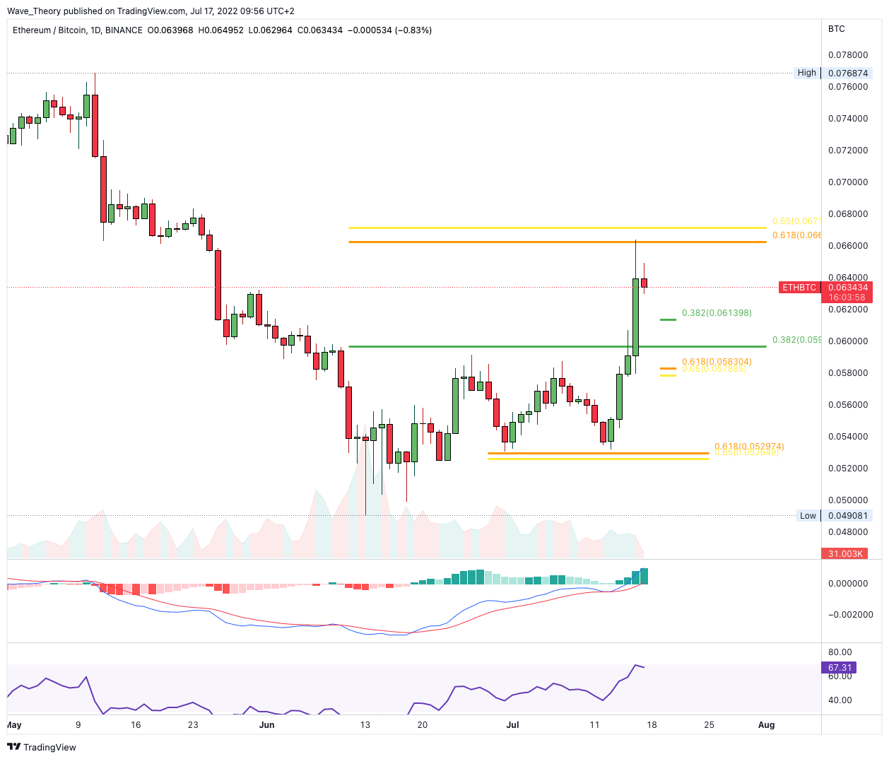 Bricht Ethereum die Golden Ratio bei rund 0,066 BTC hingegen bullisch, liegt das nächste Kursziel bei rund 0,077 BTC. Zudem entwickelt sich der MACD im Tageschart eindeutig bullisch, denn das Histogramm tickt bullisch höher und die MACD Linien sind bullisch überkreuzt.