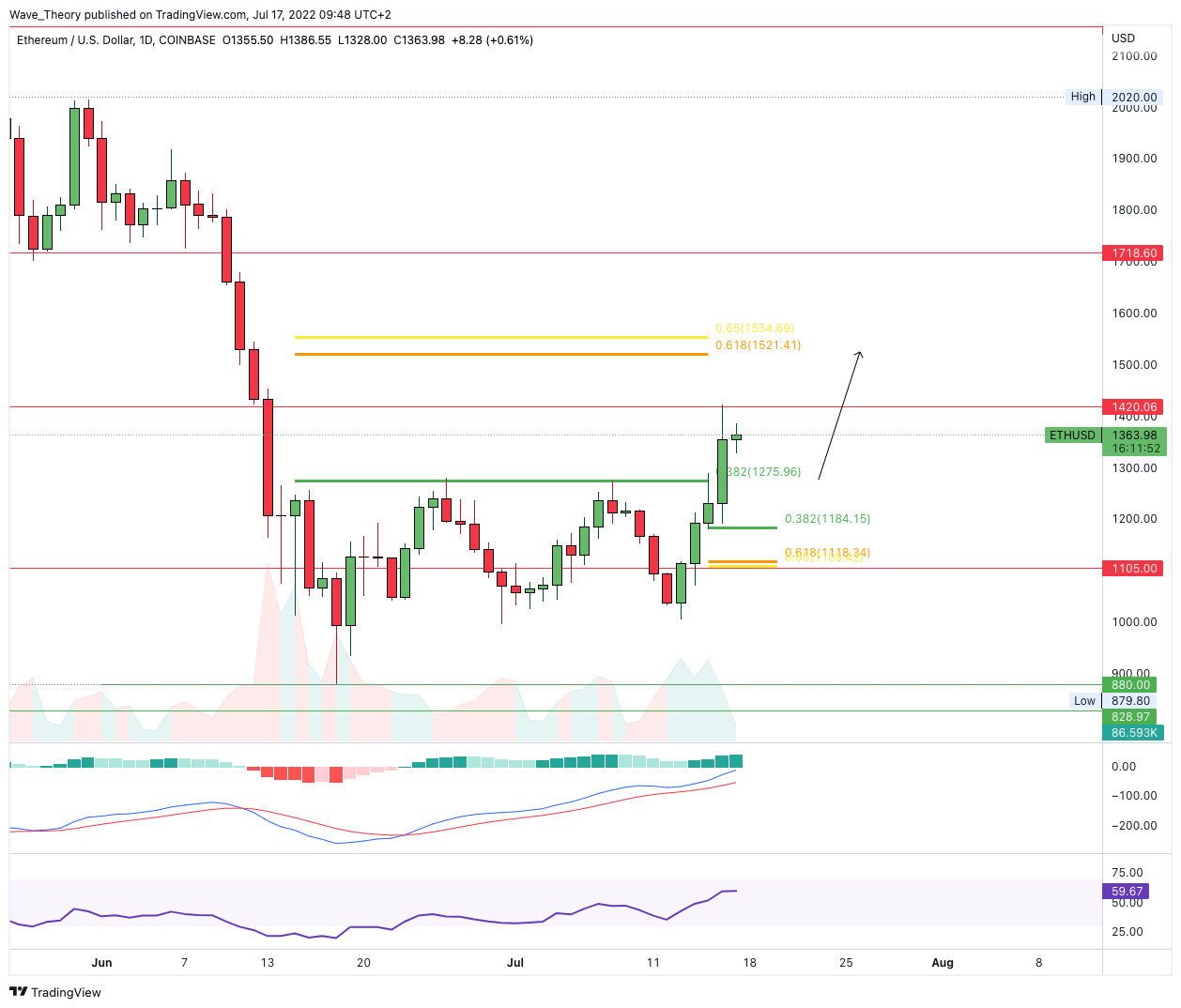 Ethereum Kurs bricht Fib Widerstand und stieg bis rund 1.420 USD