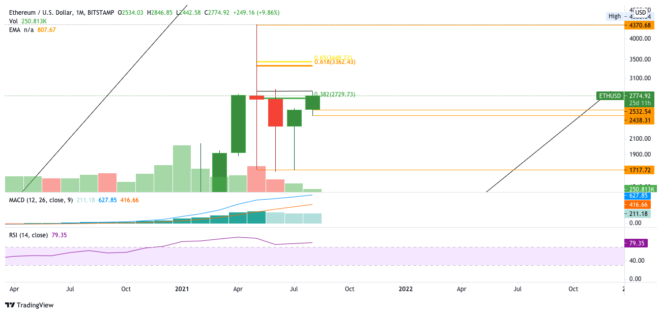 Tatsächlich befindet sich Ethereum aktuell exakt dort, wo der Monatskerzenschluss des all-time-high Monats Mai lag. Sollte Ethereum im August über diesem Niveau schließen, so sind die 3.300 USD nahezu unausweichlich auf der Agenda. Dort wird es spannend, ob Ethereum den Widerstand brechen kann, um sich auf alte Höhen zu begeben. Eine bärische Abweisung an diesem Niveau bestätigt im Gegenzug den Bärentrend.