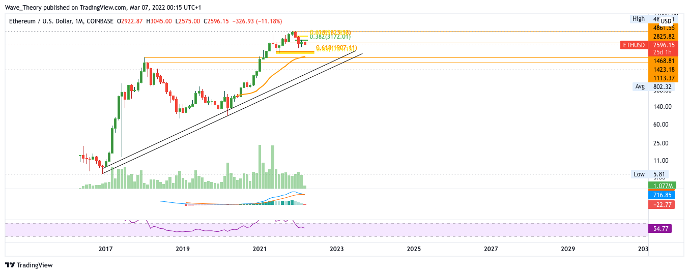 Damit Ethereum Chancen auf eine bullische Trendwende hat, muss der ETH Preis zunächst einmal den 0,382 Fib Widerstand bei rund 3.200 USD überwinden. Bricht Ethereum diesen Widerstand, so wartet bei rund 3.900 USD der entscheidende Schlüsselwiderstand auf den Ethereum Kurs, der maßgeblich dafür verantwortlich sein wird, ob Ethereum seinen Abwärtstrend fortsetzt oder erneut in einen Bullentrend gerät.