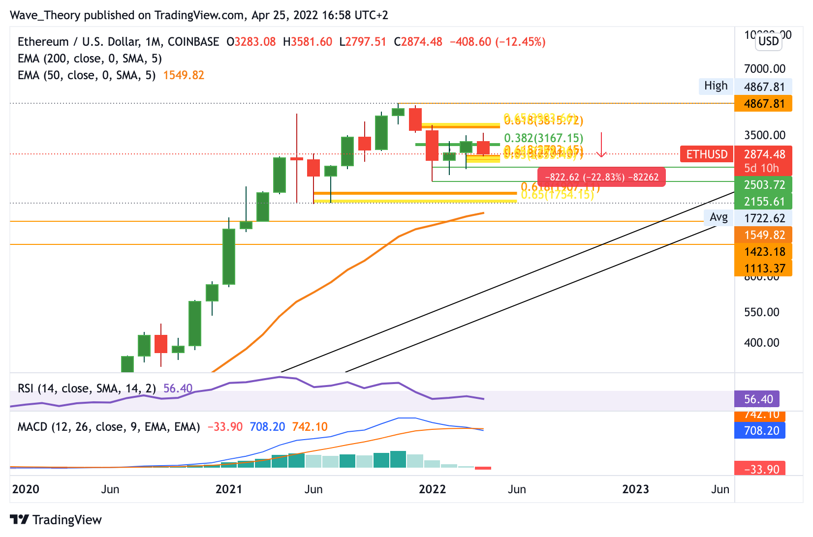 Nachdem Ethereum zwei bullische Monate hinter sich hatte, verläuft der April bisher außerordentlich bärisch für den ETH Kurs. Rund 23 % fiel der ETH Kurs in diesem Monat. Sollte der letzte Tiefpunkt bei 2.155 USD untertroffen werden, so findet Ethereum erst wieder zwischen 1.550 – 1.900 USD signifikante Unterstützung.