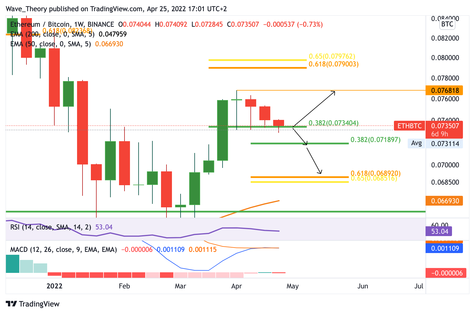 Gegen BTC befindet sich Ethereum an einem Scheideweg, denn noch befindet sich der ETH Kurs über dem 0,382 Fib Niveau bei 0,0734 BTC, an welchem er in dieser Woche abprallen könnte. Sollte Ethereum die Unterstützung jedoch bärisch durchbrechen, findet erst wieder bei 0,0719 BTC und 0,069 BTC signifikante Fibonacci Unterstützung.