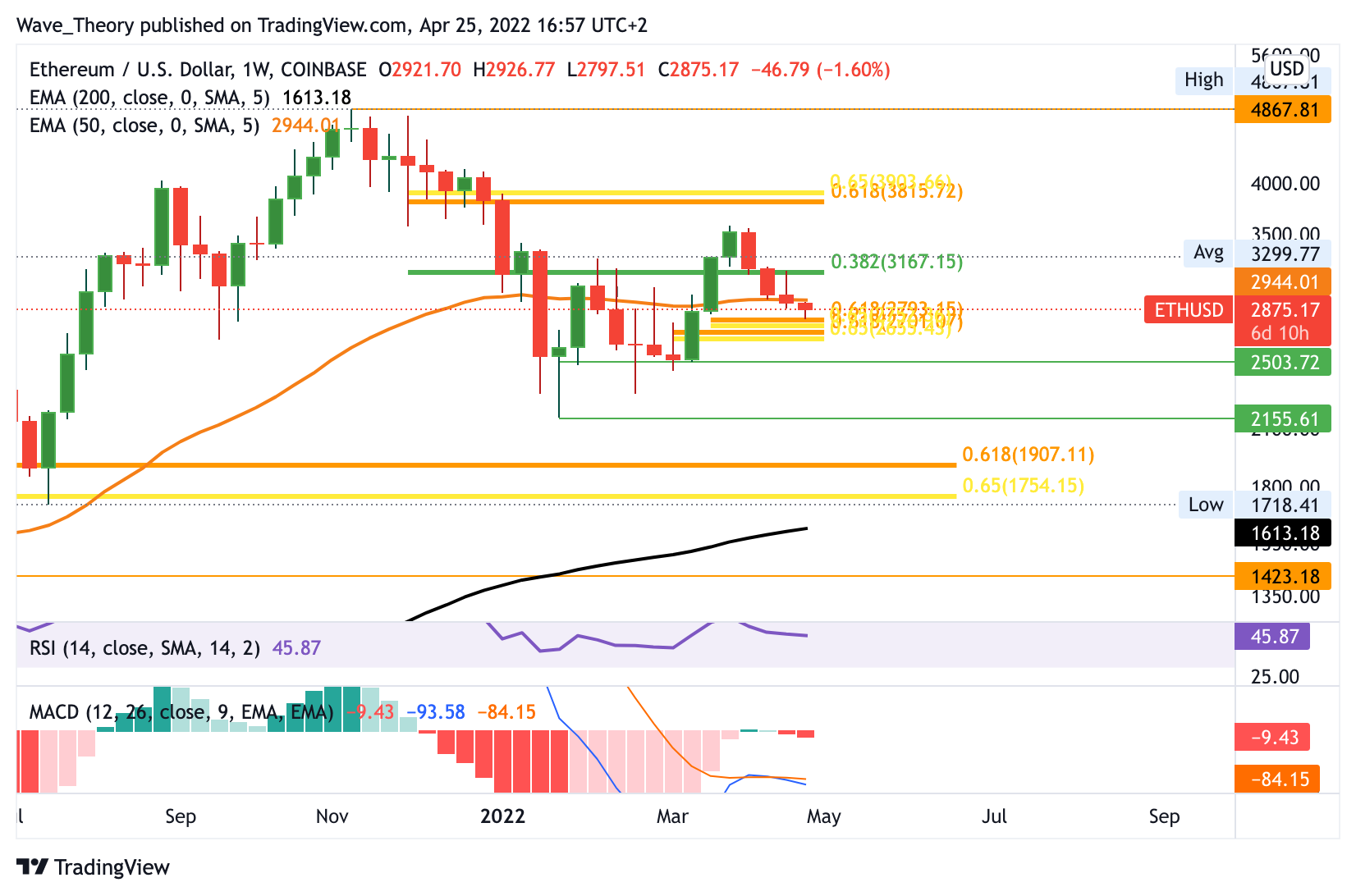 Nachdem der Ethereum Kurs in der letzten Woche bärisch am 0,382 Fib Niveau bei 3.167 USD abgewiesen wurde, setzt er in der neuen Woche den bärischen Trend fort. So scheint Ethereum in dieser Woche am 50-Wochen-EMA bei 2.944 USD bärisch abgewiesen zu werden. Es bleibt abzuwarten, ob es Ethereum gelingt, sich über der Golden Ratio bei rund 2.700 USD zu halten. Andernfalls wird Ethereum wohl auf 2.500 USD oder gar 2.155 USD zurückkehren. Schließlich zeigt sich auch der wöchentliche MACD eindeutig bärisch, denn das Histogramm tickt bärisch tiefer und die MACD Linien verbleiben bärisch überkreuzt.
