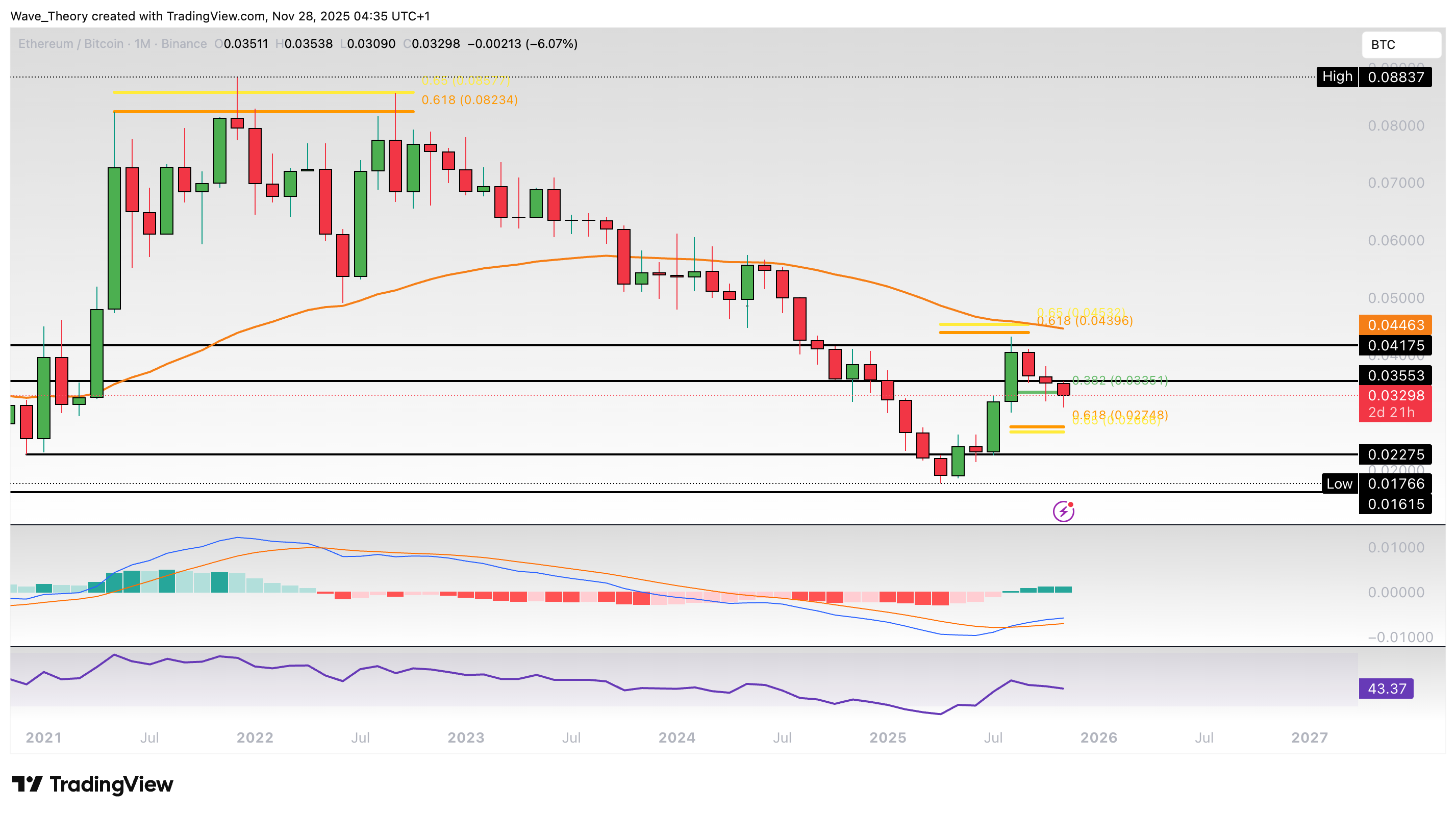 Gegen BTC wurde der ETH Kurs vor drei Monaten am Golden Ratio Widerstand knapp unterhalb des 50-Monate-EMAs bei rund 0,044 BTC bärisch abgewiesen. Damit befindet sich ETH aktuell an der 0,382 Fib Unterstützung bei rund 0,0335 BTC.