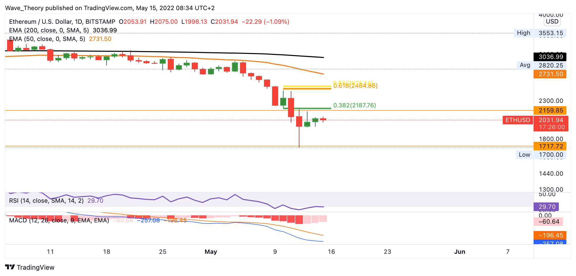 Im Tageschart tickt das Histogramm des MACDs bereits bullisch höher und auch der RSI befindet sich noch in überverkauften Regionen. Bei rund 2.200 USD und 2.500 USD stößt der Ethereum Kurs jetzt auf signifikante Fib Widerstände, die es zu überwinden gilt, sofern Ethereum vor tieferen Tiefpunkten bewahrt werden soll.