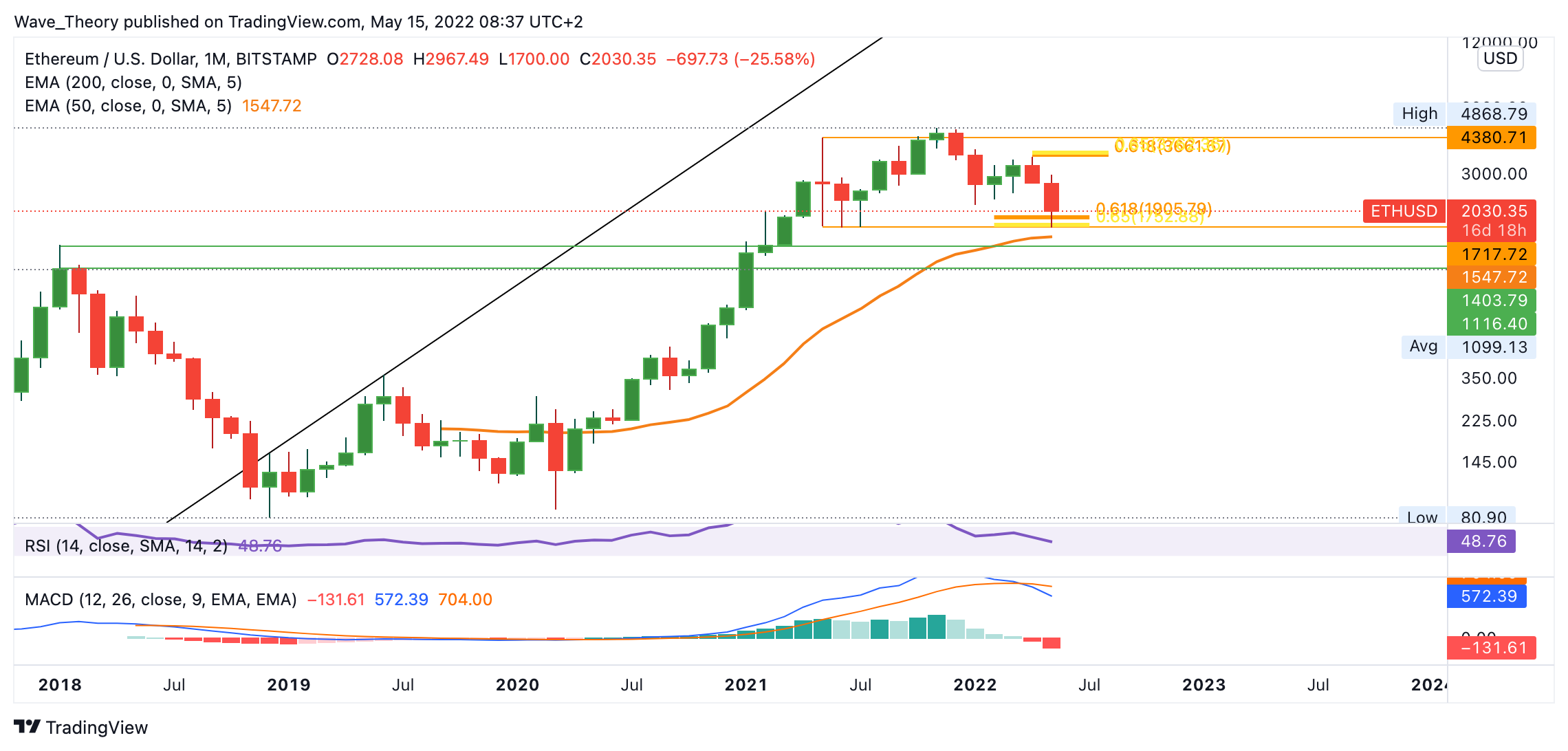 Der Ethereum Kurs erreichte die Unterstützungszone der Golden Ratio zwischen dem 50-Monate-EMA bei rund 1.650 USD – 1.900 USD und prallte sehr stark daran ab, nachdem er bei 1.700 USD einen Tiefpunkt geformt hatte. Rund 25 % prallte der ETH Kurs an dieser Unterstützung ab. Jedoch zeigt sich der MACD im Monatschart nach wie vor bärisch. Nach oben hin muss Ethereum die Golden Ratio bei rund 3.700 USD brechen, um wieder bullisch zu werden und die Korrektur offiziell zu beenden.