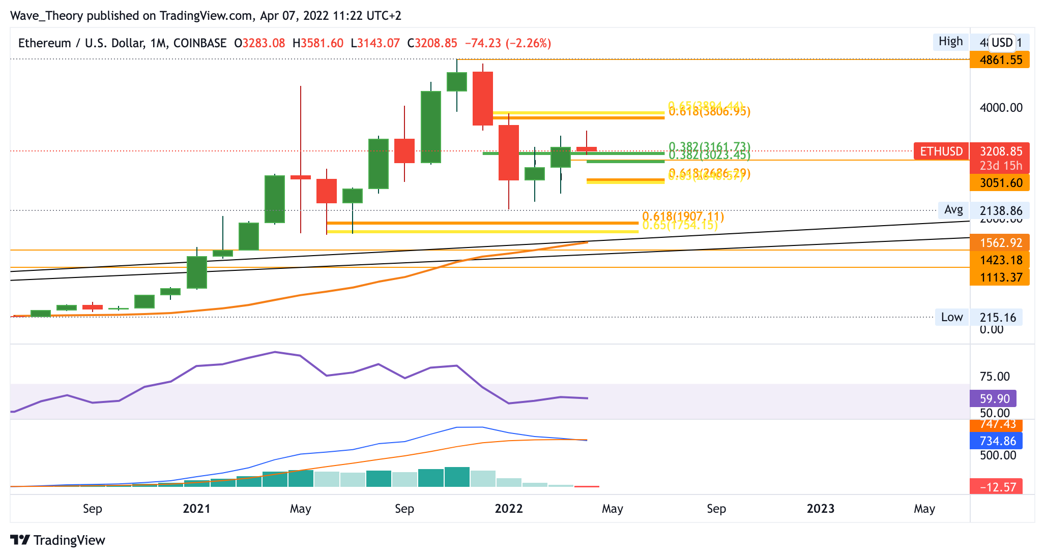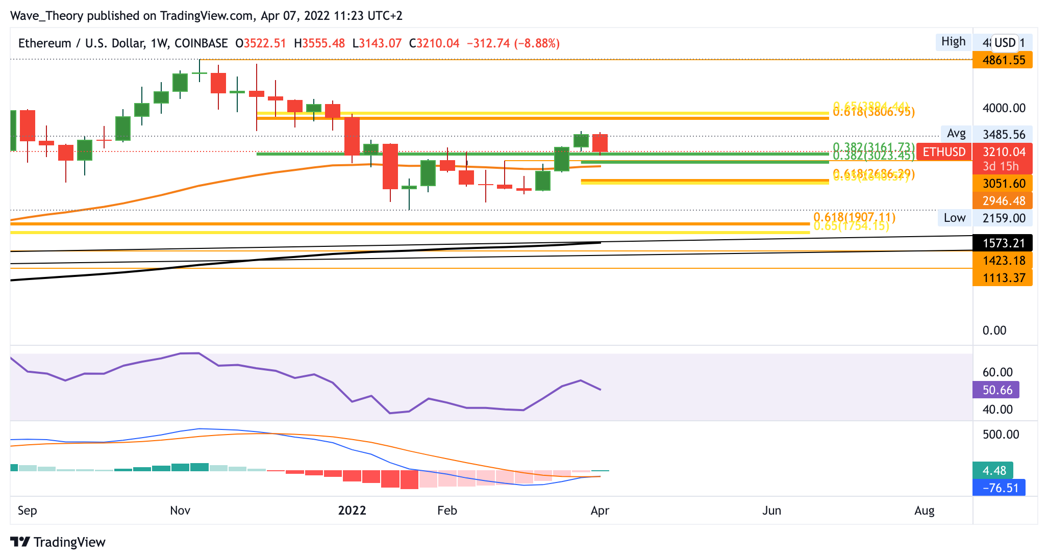 Im Monatschart hingegen zeigt sich der MACD eindeutig bärisch, denn hier überkreuzen sich die MACD Linien bärisch während das Histogramm bärisch tiefer tickt. Dennoch könnte die aktuelle Abwärtsbewegung auch eine Panikreaktion von EU-ansässigen Anlegern sein, welche sich im Laufe des Monats wieder bereinigt. Denn schließlich konnte Ethereum das 0,382 Fib Niveau bei rund 3.200 USD bullisch durchbrechen, womit die Golden Ratio bei rund 3.900 USD immer noch in Aussicht steht. Ein Wendepunkt ohne das Abprallen an einem Fib Niveau wäre sehr ungewöhnlich.