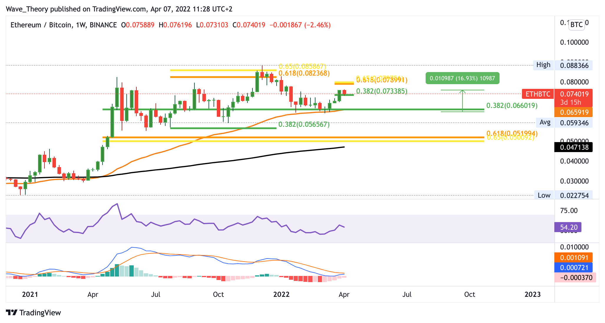 Auch gegen Bitcoin verlief es für den ETH Kurs sehr bullisch in den letzten Wochen. So stieg er ETH Kurs rund 17 % und brach dabei das 0,382 Fib Niveau bei rund 0,073 BTC. Damit liegen die nächsten signifikanten Widerstände bei rund 0,08 BTC und 0,085 BTC. Sollte Ethereum die Korrekturbewegung jetzt fortsetzten, findet er spätestens bei 0,066 BTC Unterstützung. Gegen BTC zeigt sich der MACD im Wochenchart jedoch noch immer bullisch. Insgesamt zeigt sich ETH Kurs auf jeden Fall bullischer als der BTC Kurs.