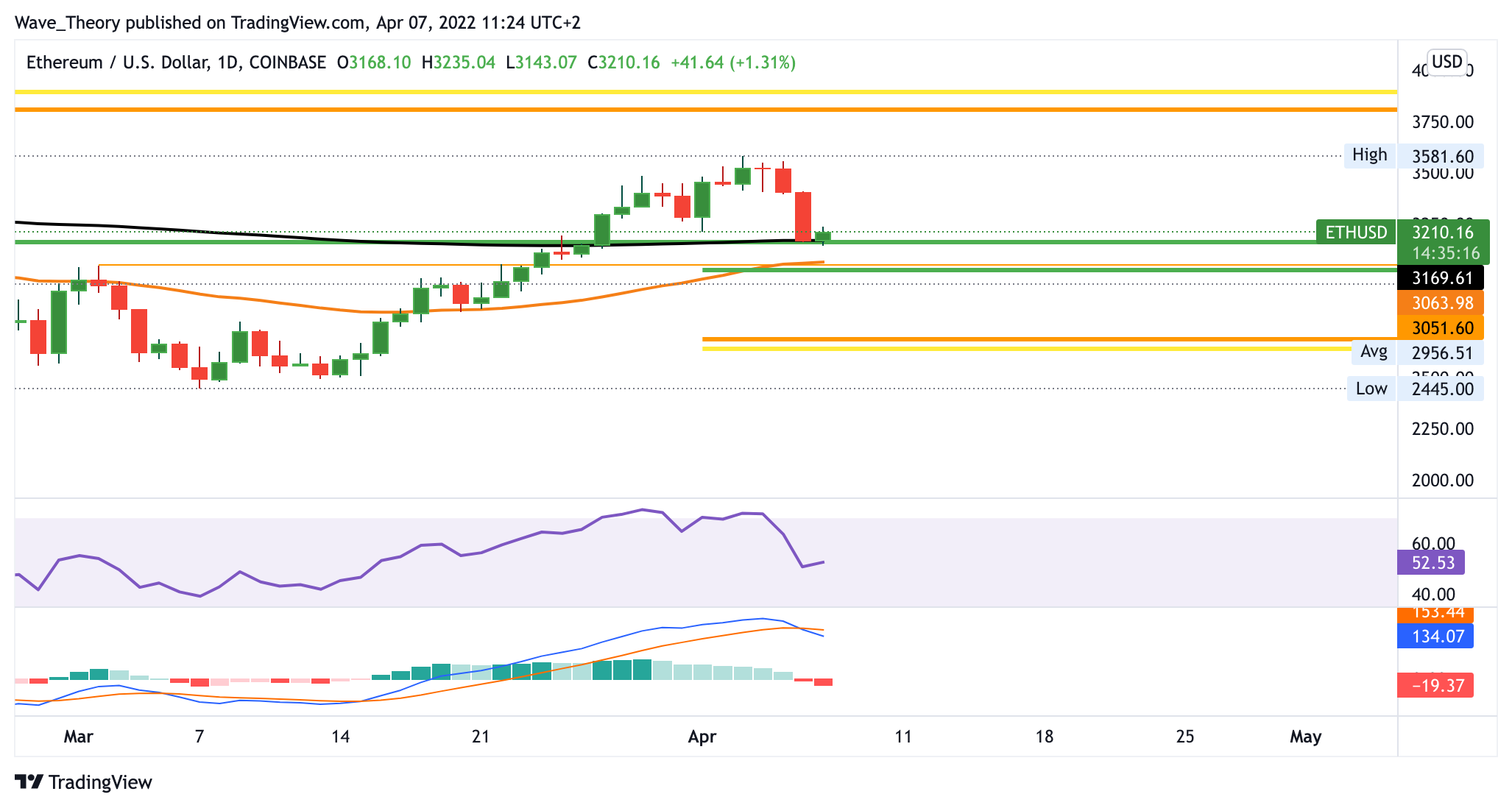 Im Wochenchart liegen die MACD Linien aufeinander, womit die Linien kurz vor einer bullischen Überkreuzung stehen könnten. Das Histogramm entwickelt sich jedenfalls schon seit Ende Januar bullisch nach oben. Sollte der Ethereum Kurs jedoch unter die Unterstützung zwischen 3.000 – 3.200 USD brechen, findet er erst wieder bei rund 2.600 USD signifikante Unterstützung. Gelingt es dem Ethereum Kurs nicht, dort stark abzuprallen, könnte er sogar zur Golden Ratio bei rund 1.900 USD zurückkehren.