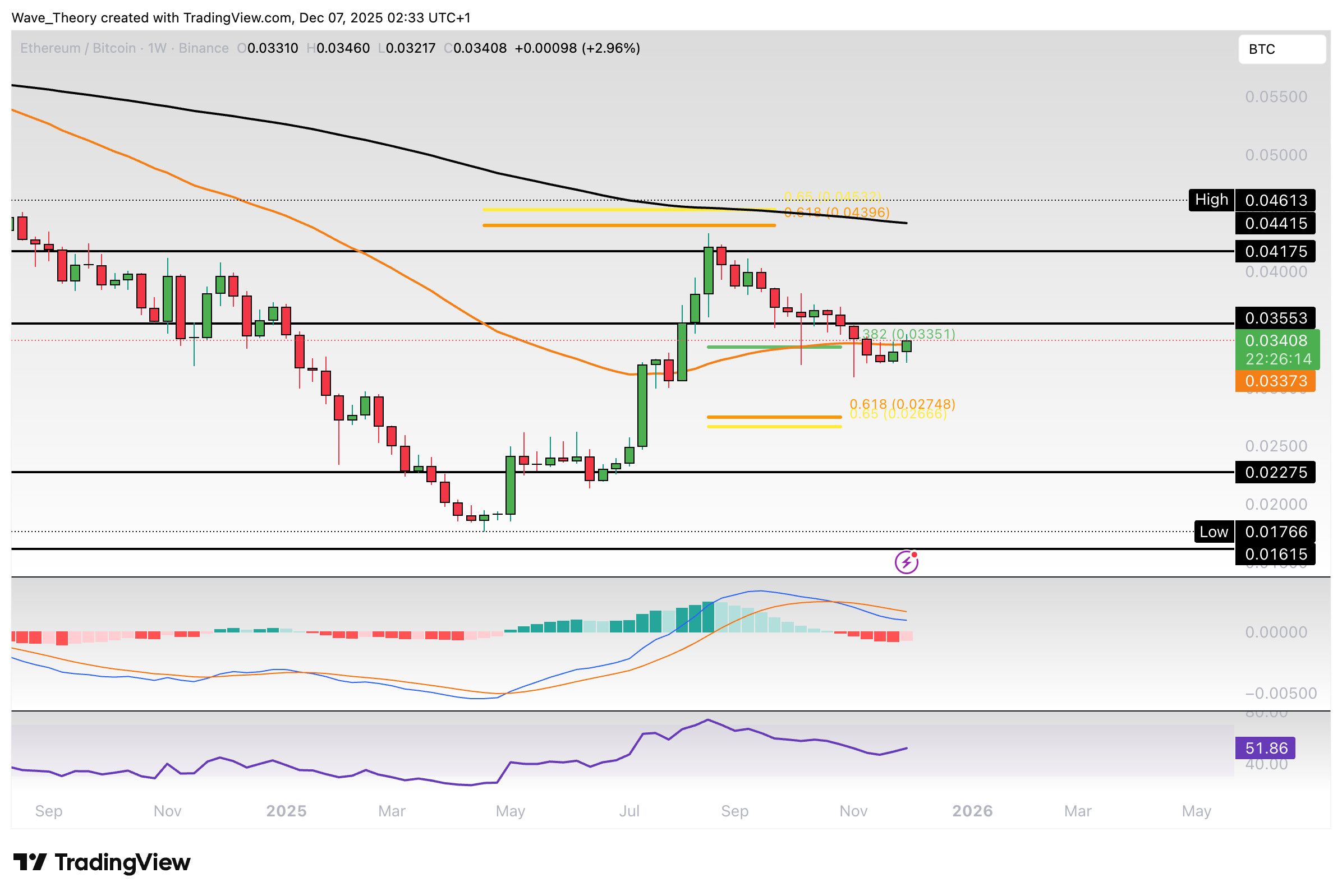 Nach unten hin wartet am Golden Ratio Niveau bei rund 0,027 BTC die nächste signifikante Unterstützung. Die Indikatoren geben dabei gemischte Signale im Wochenchart.