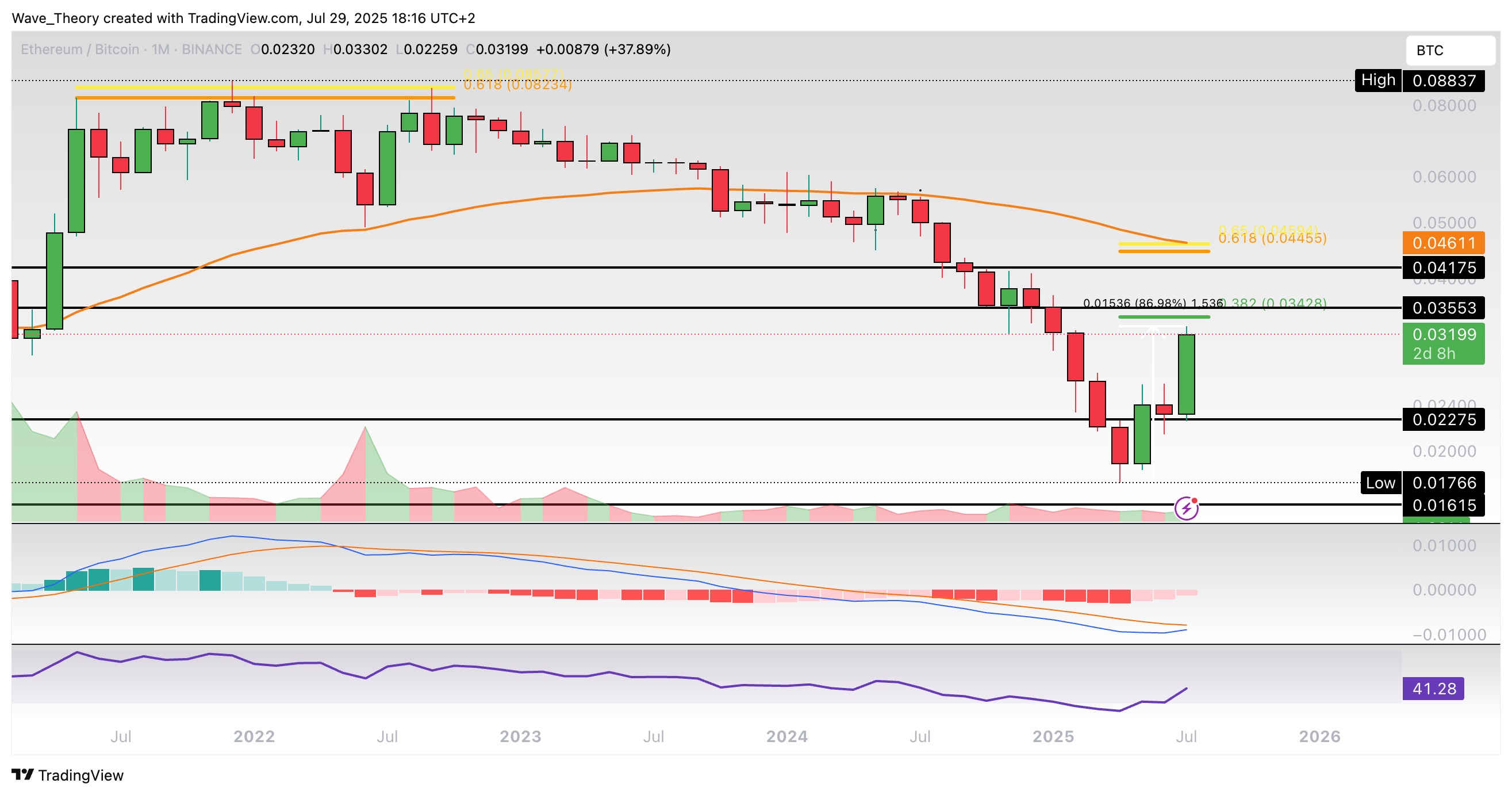 Damit warten jetzt bei rund 0,034 BTC und bei rund 0,045 BTC die nächsten signifikanten Fib Widerstände. Bei rund 0,046 BTC fungiert zudem der 50-Monate-EMA als zusätzlicher Widerstand.