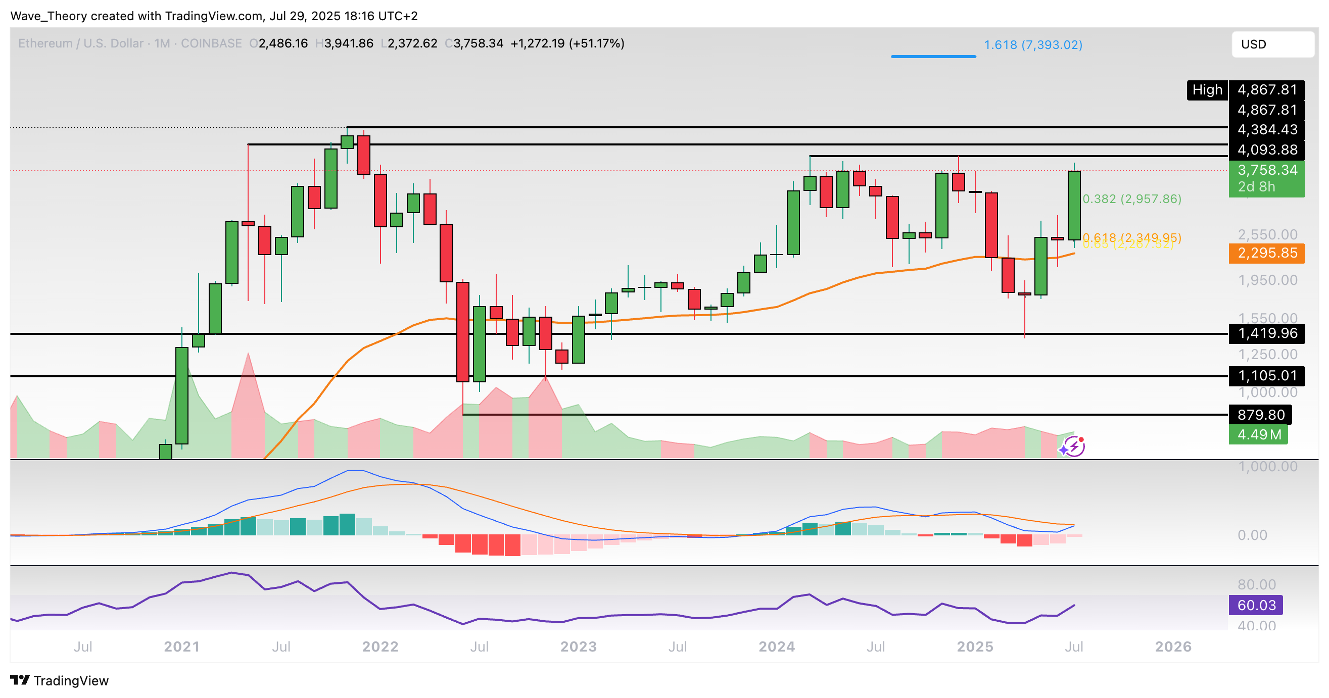 Sollte Ethereum mittelfristig das Allzeithoch bei rund 4.868 USD überwinden, könnte er zum Fib Projektionslevel bei rund 7.393 USD steigen.