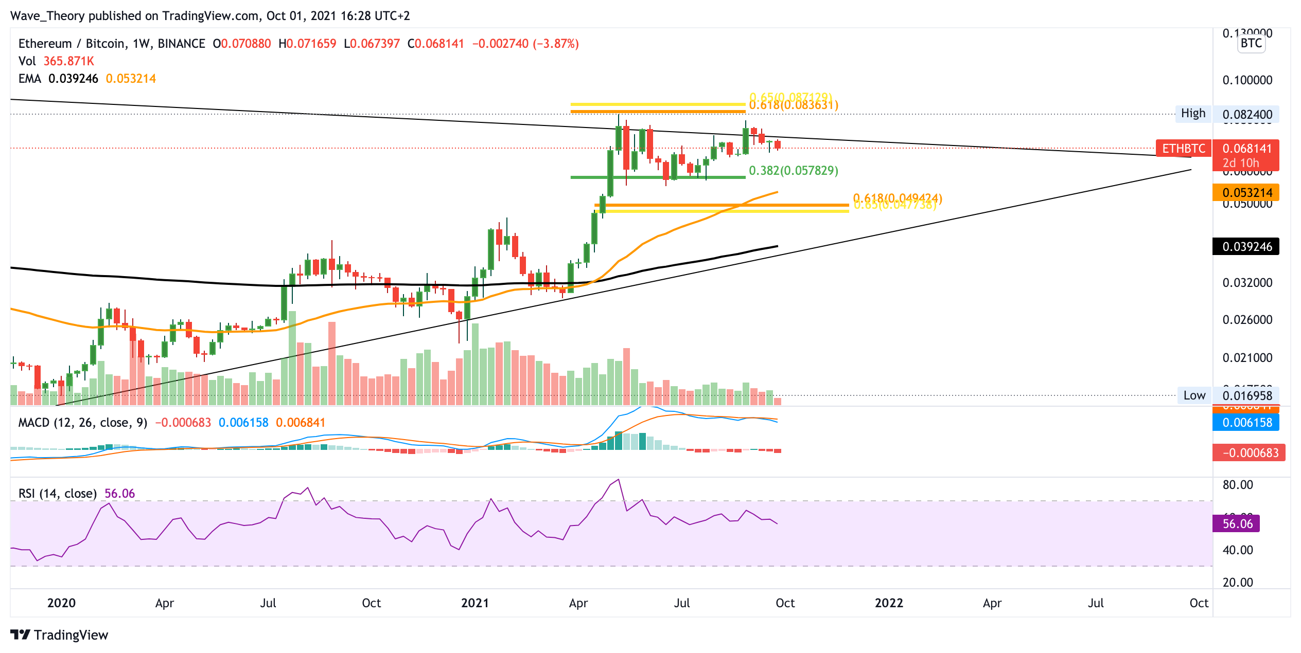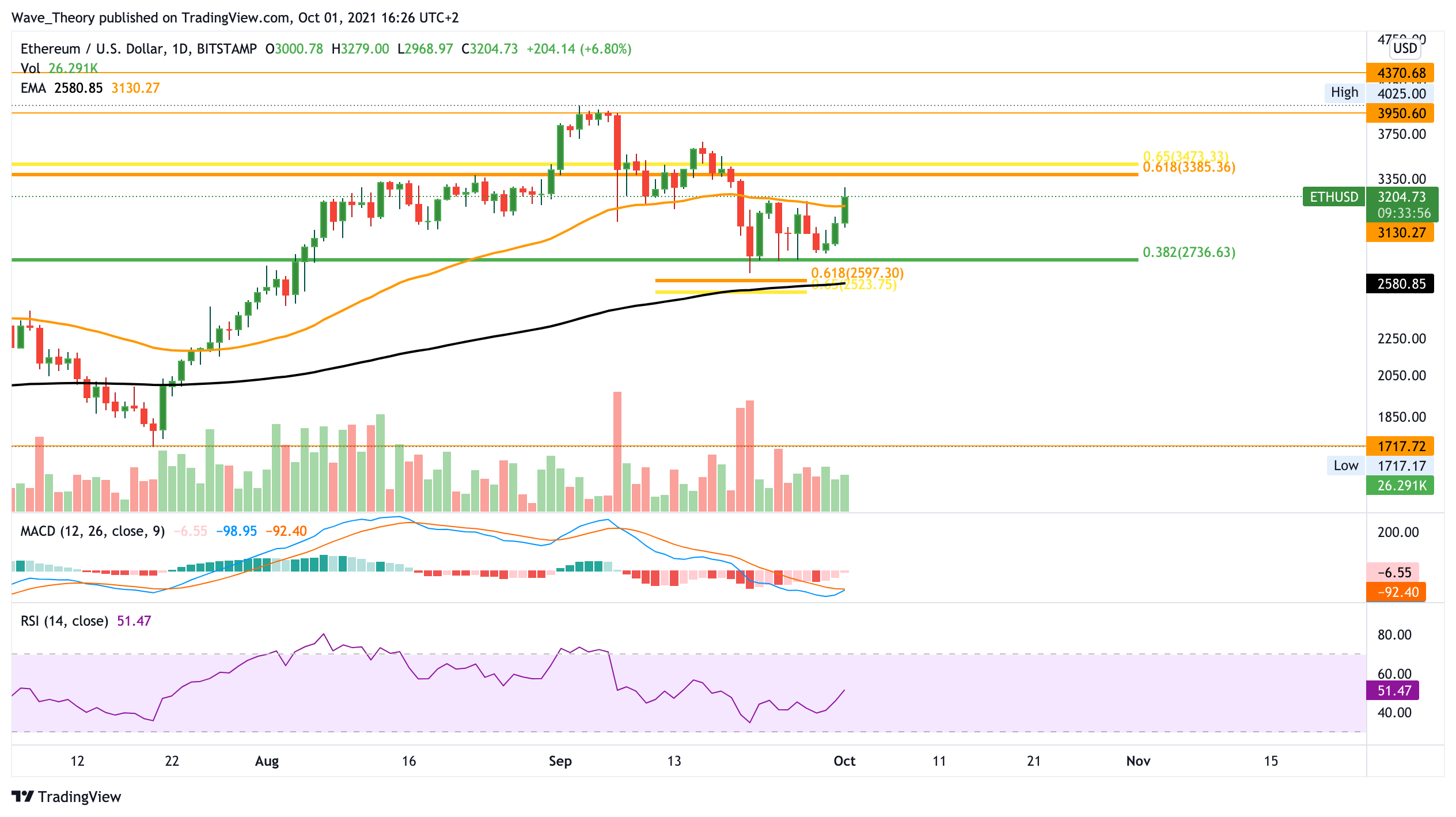 ETH könnte in Zuge eines bullischen Bruchs der Golden Ratio bei rund 3.300 USD das Allzeithoch bei rund 4.400 USD überwinden, um auf das nächste Fibonacci Niveau bei rund 6.100 USD zu steigen. Jedoch signalisiert der wöchentliche MACD den Beginn einer Abwärtsbewegung. Denn es liegt ein absteigendes Histogramm gepaart mit einer bärischen Überkreuzung der MACD Linien vor. Sollte Ethereum an der Unterstützung zwischen 2.600 – 2.700 USD keinen Halt finden, so findet er spätestens bei 1.700 USD sehr starke Unterstützung. Dazwischen eilt aber noch der 50-Wochen-EMA bei rund 2.200 USD zur Hilfe.