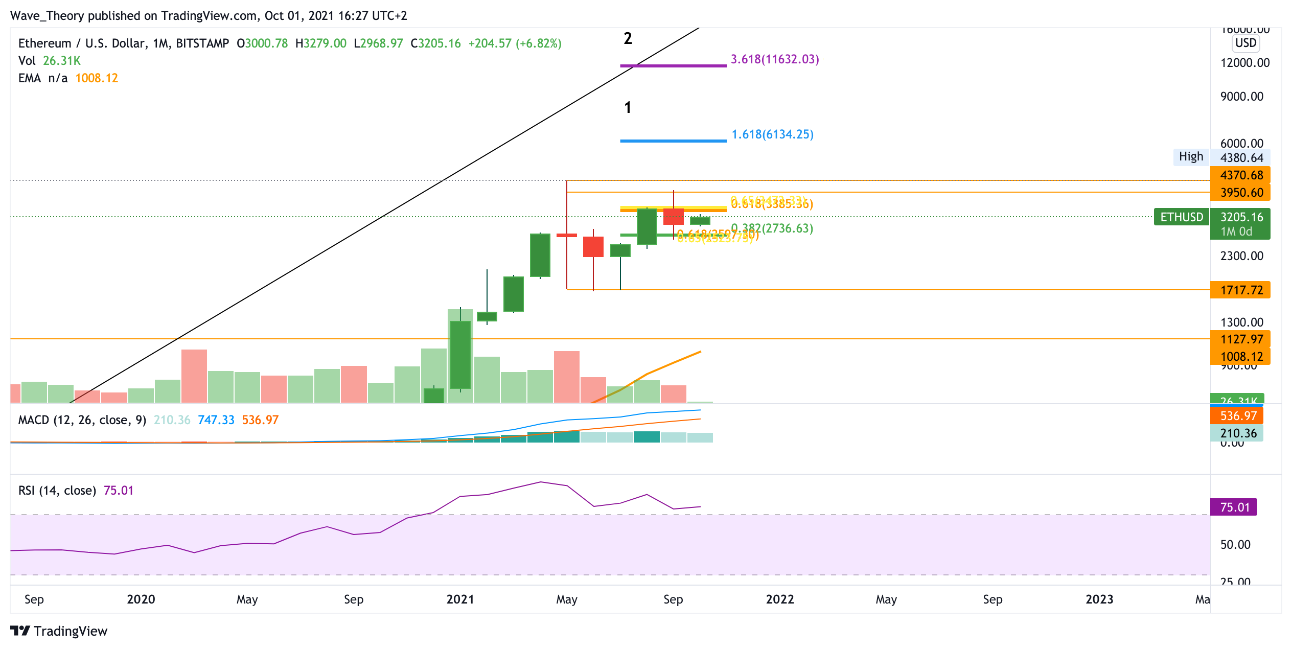 Sollte Ethereum das Allzeithoch übertreffen, so findet er nach dem Fibonacci Niveau bei 6.100 USD seinen nächsten Widerstand bei rund 11.500 USD, welches das langfristige Bullenziel für Ethereum markiert. Auf historische Unterstützung stößt der Ethereum Kurs spätstens zwischen 1.000 – 1.100 USD. Dort fungiert der 50-Monate-EMA als zusätzliche Unterstützung.